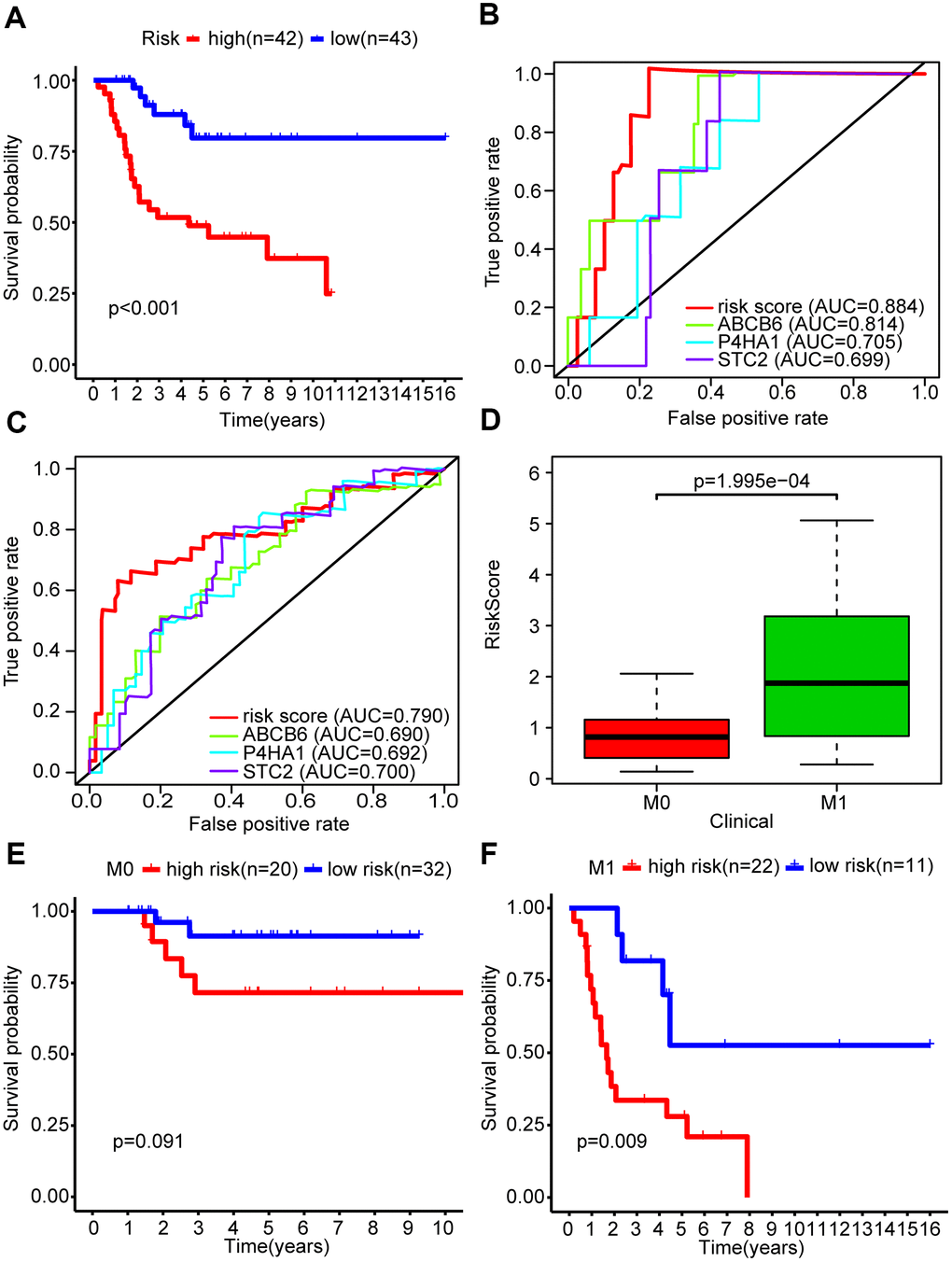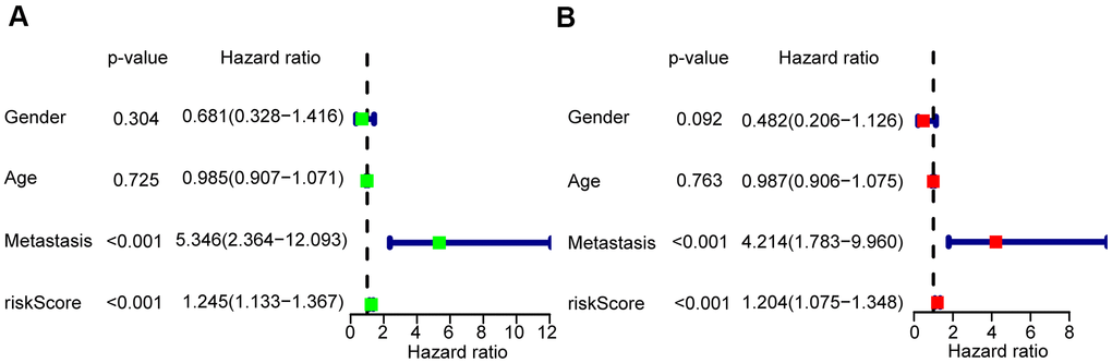 To verify whether the risk scores were independent of other clinical characteristics, we performed univariate and multivariate Cox regression analyses. The age of 15 was the median age among the 85 OS patients, with 48 male and 37 female patients were included in the TARGET database. This group included 33 patients who presented with metastasis, and 52 without. Through both univariate and multivariate Cox analyses, the risk scores and the clinicopathological parameters of metastasis were demonstrated to be independent prognostic factors in OS to predict the prognosis of OS patients (P < 0.001) (Figure 4A, 4B).