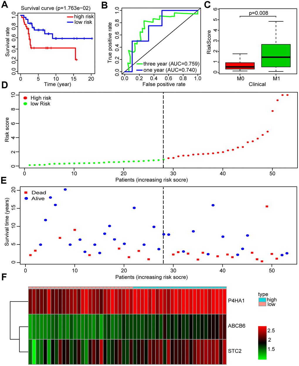 A GEO data set (GSE21257) was chosen by us as a validation cohort to ensure the reliability of the established glycolysis-related risk signature. This cohort comprised 53 cases of which 25 were in the high-risk group and 28 in the low-risk group, based on the risk signature. Low survival rates of patients were consistently seen in the high-risk group (Figure 5A). The risk signature’s prognostic efficiency was assessed using the ROC curve analysis in the validation group; the AUC was 0.740 at 1 year and 0.759 at 3 years (Figure 5B). Moreover, in this validation cohort patients with metastasis had a higher risk score than those without metastasis (P<0.01) (Figure 5C). Higher mortality and lower patient survival rates were observed in the high-risk group compared with the low-risk group (Figure 5D, 5E). A heatmap was drawn according to the expression profiles of the risk genes between both groups (Figure 5F). We found that the risk genes showed a higher expression in the high-risk group compared to the low-risk group. We further verified the prognostic potential of the three glycolysis-related risk genes in the R2 database (http://r2.amc.nl). The high-P4HA1 expression group had a lower overall survival probability and metastasis-free survival probability than the low-P4HA1 expression group (Supplementary Figure 3A). The high-STC2 expression group had a lower overall survival probability than the low-STC2 expression group (Supplementary Figure 3B). The high-ABCB6 expression group also showed a lower metastasis-free survival probability than the low-ABCB6 expression group (Supplementary Figure 3C). We also collected five metastatic human OS tissues and five non-metastatic human OS tissues. The results of western blotting showed that the risk genes (P4HA1, ABCB6, and STC2) had higher expressions in metastatic human OS tissues than non-metastatic human OS tissues (Supplementary Figure 4). These results demonstrated that the risk model constructed from the three risk genes was a good predictive instrument for prognosis in the validation cohort.