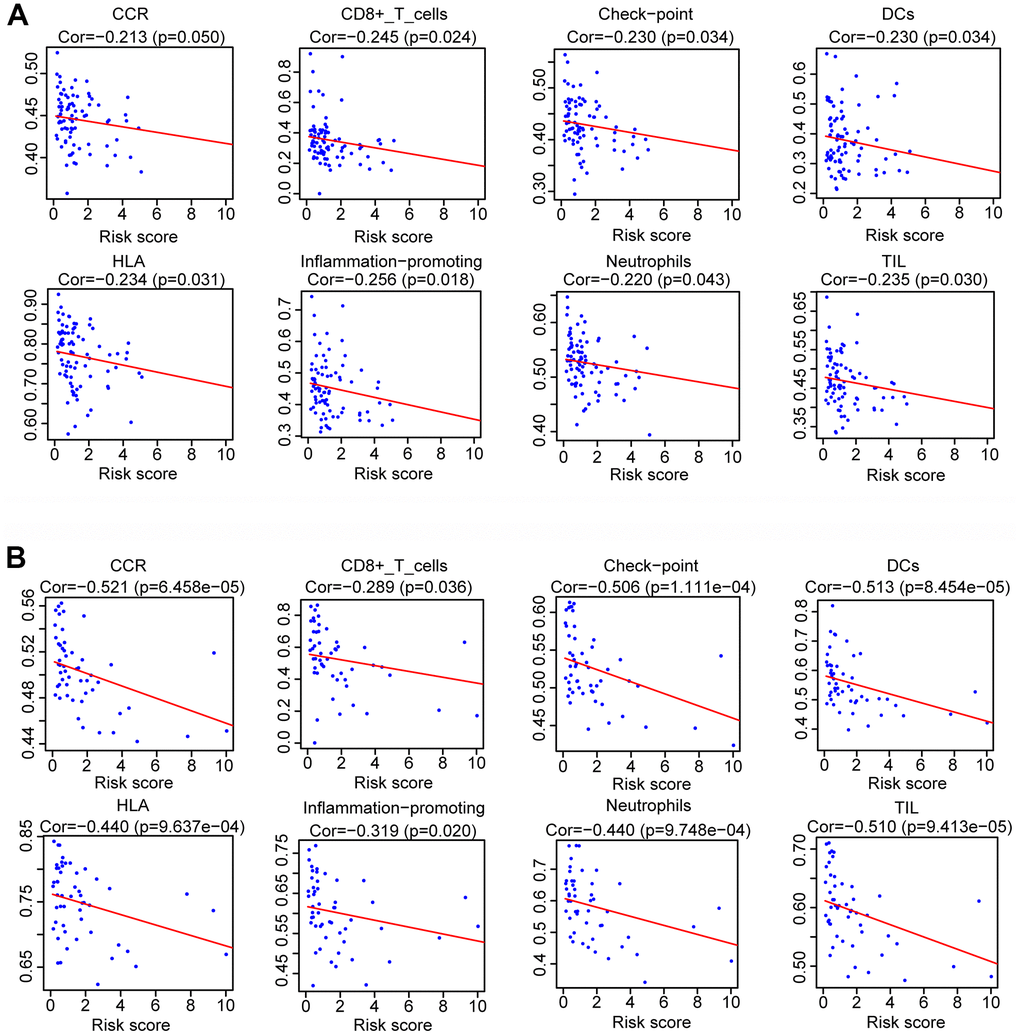The relationship between glycolysis and immune response has been reported by many researchers. Souto-Carneiro et al. found that increased glycolytic activity promotes the proinflammatory profile of CD8+ T cells [40]. Also, Hu et al. showed that overexpression of CD47 plays an important part in tumor cell immune evasion and enhances glycolysis in colorectal cancer cells [41]. Likewise, we used the ESTIMATE algorithms and ssGSEA to analyze the OS samples in the two cohorts and discovered that patients in the high-risk group had lower immune scores and immune infiltration levels than those of the low-risk group. Petitprez et al. revealed that B cells played a critical role in the immunotherapy response of patients with sarcoma and were associated with the prognosis of patients [42]. Milcah et al. found that decreased immune cells correlated with metastasis and poor prognosis of patients with OS [43]. Consistent with these findings, we revealed that the risk score calculated from our established risk signature was negatively correlated with the proportions of CCR, CD8+_T_cells, neutrophils, TILs, dendritic cells (DCs), HLA and inflammatory promoting cells in both training and validation cohorts. Therefore, we suggested that immune infiltration levels of OS were correlated with the glycolysis-related risk signature and the underlying mechanisms need to be further explored.