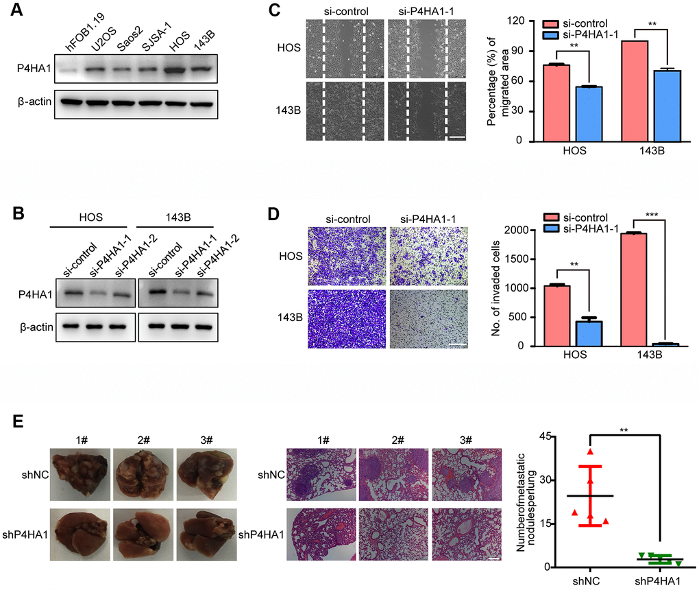 To further examine the role of the three genes in the metastasis of OS, P4HA1 was analyzed in more detail. We verified the expression of P4HA1 in OS cell lines and the hFOB1.19 human osteoblast. The results of western blotting indicated that P4HA1 showed a higher expression in human OS cells than in the osteoblast cell line hFOB1.19 (Figure 9A). To further verify the function of P4HA1 in OS progression, we transfected si-P4HA1 into HOS and 143B OS cell lines. Knockdown efficiency was verified by western blotting (Figure 9B) and si-P4HA1-1 selected for the subsequent experiments. According to the results of the wound-healing assay, knockdown of P4HA1 could restrain the migration of OS in the HOS and 143B cell lines (Figure 9C). Furthermore, the transwell invasion assay results corroborated with those of the wound-healing assay in HOS and 143B cell lines (Figure 9D), indicating that P4HA1 indeed played a vital role in the metastasis of OS in vitro. Next, we further verified the role of P4HA1 in OS metastasis in vivo. The numbers of lung metastatic nodules in P4HA1-knockdown orthotopic OS-implanted mice were fewer than those in the control group (Figure 9E). These results further confirmed our previous results (Figure 2A–2C).