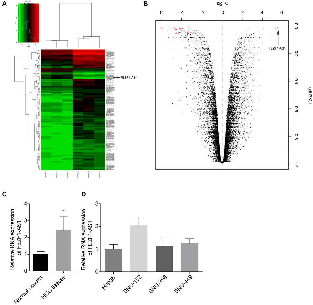 The HCC tumorigenesis always accompanied with alteration of genes, and growing evidence suggested that lncRNAs are critical for cancer procession [21]. To explore the expression profiles of lncRNAs in HCC, the Arraystar Human lncRNA Microarray was performed in 3 paired HCC tissues and the neighboring normal tissues. A prominent alteration in FEZF1-AS1 level was found in the lncRNA profile (Figure 1A, 1B). The expression level of FEZF1-AS1 was found to be upregulated in HCC tissues as compared to the adjacent normal liver tissues by qRT-PCR (Figure 1C). We then detected the FEZF1-AS1 expression level in HCC cell lines. FEZF1-AS1 showed a higher expression pattern in SUN-182 cells and a lower expression pattern in Hep3b cells among the 4 cells, SNU-182, SNU-398, SNU-449 and Hep3b (Figure 1D).