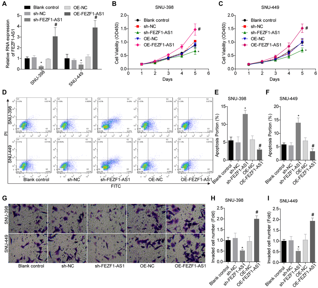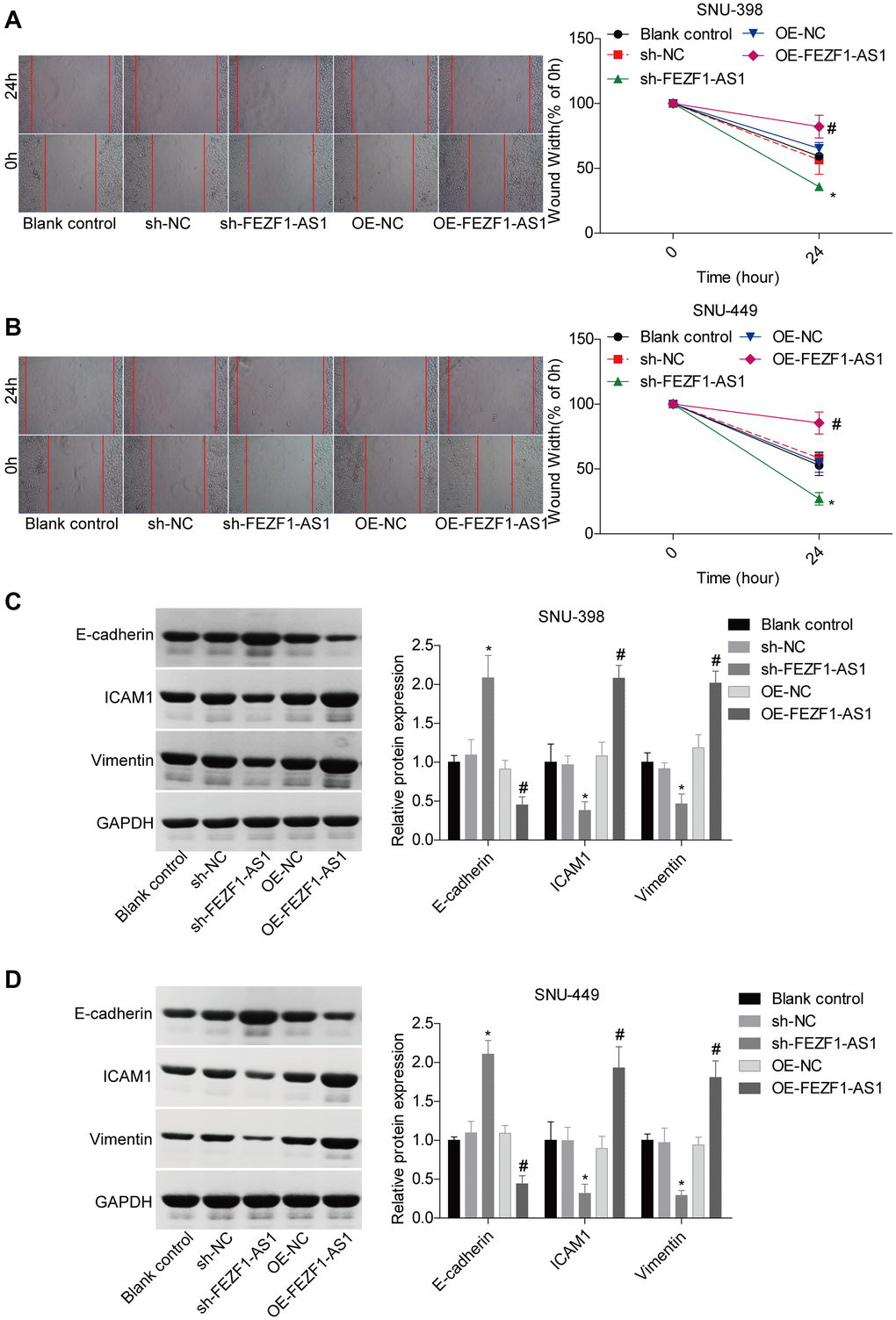 To investigate the role of FEZF1-AS1 in HCC, it was overexpressed and downregulated in SNU-398 and SNU-449 because these two cells showed moderate level of EFZF-AS1 among the 4 cells (Figure 1D). qRT-PCR was used to detect the FEZF1-AS1 expression (Figure 2A) and CCK8 assay was used to assess the cell proliferation. Overexpression or downregulation of FEZF1-AS1 promoted or suppressed cell proliferation of SNU-398 and SNU-449 cells (Figure 2B, 2C). The flow cytometry demonstrated that FEZF1-AS1 overexpression suppressed the apoptosis of SNU-398 and SNU-449 cells (Figure 2D–2F). The results of transwell chamber and wound healing assays showed that FEZF1-AS1 overexpression significantly enhanced the invasion (Figure 2G–2I) and migration (Figure 3A, 3B) of HCC cells, and downregulation of FEZF1-AS1 caused opposite results. It is believed that EMT is a main cause of cancer cell migration and invasion. Therefore, we assessed FEZF1-AS1 role in HCC cell EMT. Results of western blot showed that FEZF1-AS1 overexpression induced EMT in HCC cells with increased expression levels of ICAM1 and Vimentin and decreased expression level of E-cadherin (Figure 3C, 3D), while downregulation of FEZF1-AS1 decreased ICAM1 and Vimentin expression and increased E-cadherin expression.