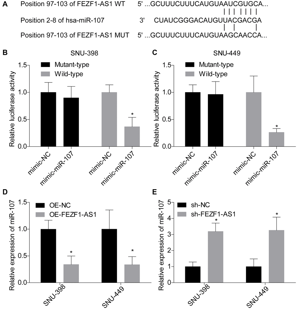 Previous clues demonstrated that lncRNA was a molecular sponge of miRNA to impair their roles in repression the expression of target genes [22]. Herein, we found that miR-107 was targeted by FEZF1-AS1 and the binding sites were calculated by bioinformatics toll RagRNA2.0 (Figure 4A). The interaction between FEZF1-AS1 and miR-107 was then verified by the luciferase reporter assay. Co-transfection with psiCHEK2-FEZF1-AS1-WT and miR-107 mimics dominantly repressed the luciferase activity as compared to the mimic-NC group in SNU-398 and SNU-449 cells (Figure 4B, 4C). No obvious difference in the luciferase activity was observed between psiCHEK2-FEZF1-AS1-MUT with miR-107 mimics and psiCHEK2-FEZF1-AS1-MUT with miR-NC mimics groups (Figure 4B, 4C). To identify the relationship between FEZF1-AS1 and miR-107, we assessed miR-107 expression in SNU-398 and SNU-449 cells. FEZF1-AS1 overexpression significantly reduced miR-107 expression level (Figure 4D). On the contrary, FEZF1-AS1 downregulation decreased miR-107 expression level (Figure 4E).