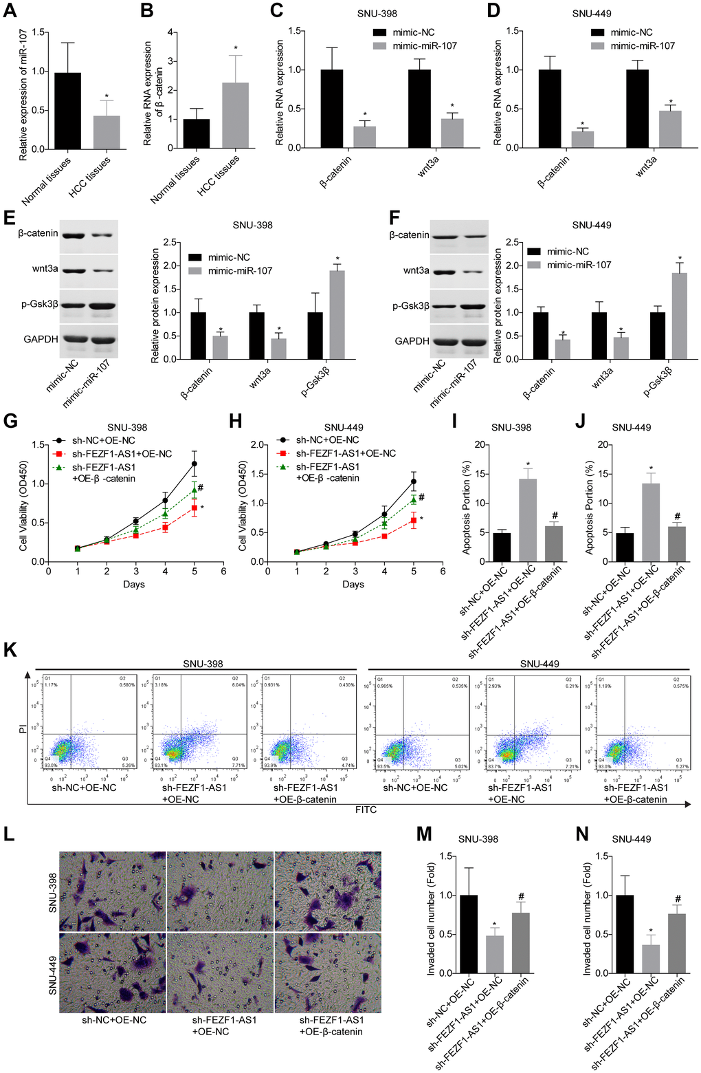 Hep3b, SNU-182, SNU-398 and SNU-449 cell lines were obtained from the American Type Culture Collection (ATCC, VA, USA). Cells were cultured in DMEM solution (Thermo Fisher scientific, NYC, USA), with 10% fetal bovine serum (FBS, Gibco, CA, USA) and 1% penicillin/streptomycin (Invitrogen, CA, USA).The shRNA used to knockdown FEZF1-AS1 (sh-FEZF1-AS1), the mimic used to upregulate miR-107 (mimic-miR-107), the plasmid used to overexpress FEZF1-AS1 (OE-FEZF1-AS1) and the lentivirus vector used to overexpress β-catenin (OE-β-catenin), as well as the negative controls (NC) were produced by GenePharma Co., LTD (Shanghai, China). Cells were transfected with mimic-NC, mimic-miR-107, OE-FEZF1-AS1 or OE-NC by using of Lipofectamine 2000 (Invitrogen, Carlsbad, CA, USA) according to the instruction. Other lentivirus vectors were infected into cells using polybrene and then incubated with puromycin and/or G418 for two weeks.