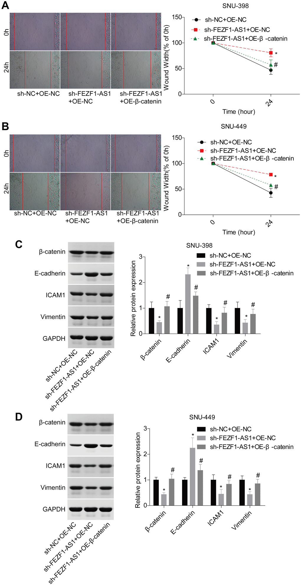 A previous study demonstrated that miR-107 involved in osteosarcoma by targeting Wnt/β-catenin pathway [23]. To explore whether FEZF1-AS1 targeted the miR-107/Wnt/β-catenin axis, we also assessed miR-107 and β-catenin levels in HCC. Compared to the adjacent normal liver tissues, miR-107 expression level was decreased and β-catenin expression level was increased in HCC tissues (Figure 5A, 5B). Then, miR-107 was overexpressed in SNU-398 and SNU-449 cells to assess its effect on the Wnt/β-catenin pathway. Western blot showed that miR-107 overexpression obviously suppressed the β-catenin and wnt3a expressions but enhanced the p-Gsk3β expression in SNU-398 and SNU-449 cells (Figure 5C–5F). To identify the involvement of Wnt/β-catenin signaling, the rescue assay was carried out. CCK8 assay showed that β-catenin overexpression significantly rescued the proliferation inhibition caused by FEZF1-AS1 shRNA in SNU-398 and SNU-449 cells (Figure 5G, 5H). The flow cytometry result showed that downregulation of FEZF1-AS1 enhanced cell apoptosis, while overexpression of β-catenin inhibited cell apoptosis in SNU-398 and SNU-449 cells (Figure 5I–5K). Also, upregulation of β-catenin promoted cell invasion (Figure 5L–5N) and migration (Figure 6A, 6B) which were inhibited by sh-FEZF1-AS1. Furthermore, western blot displayed that β-catenin overexpression increased ICAM1 and Vimentin expression levels which were suppressed by sh-FEZF1-AS1, and decreased E-cadherin expression level which was enhanced by sh-FEZF1-AS1 (Figure 6C, 6D).