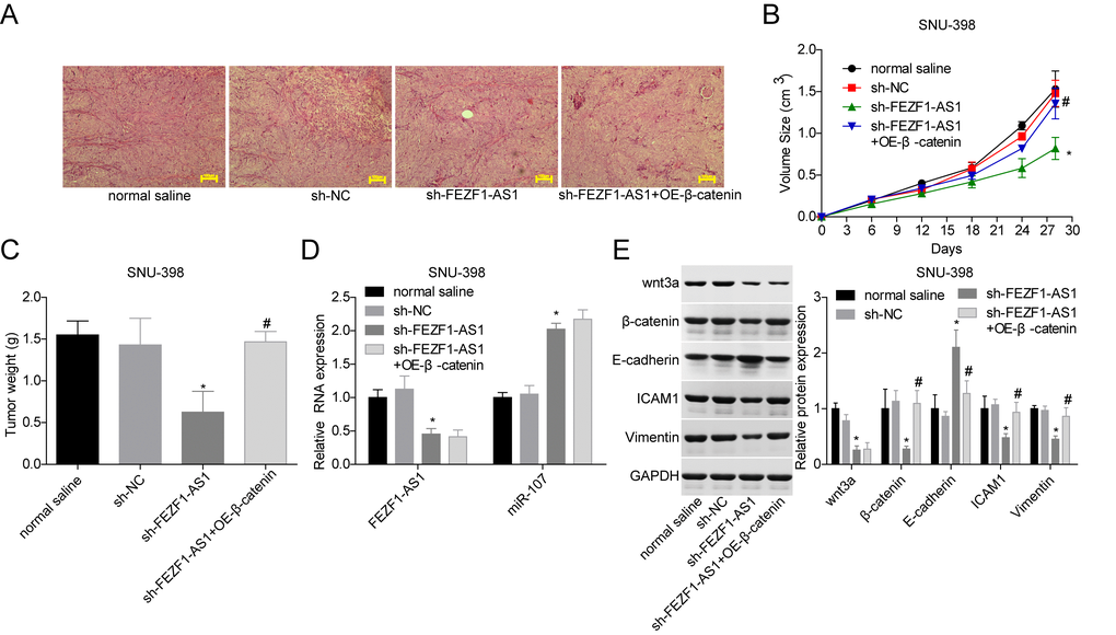 To verify the function of FEZF1-AS1 in HCC in vivo, SUN-398 cells with FEZF1-AS1 stable downregulation and/or β-catenin stable overexpression were transplanted into nude mice. Figure 7A showed the histopathological changes of the mice tissues and no cachexia was found after the nude mice were sacrificed. Downregulation of FEZF1-AS1 inhibited tumor growth with smaller volumes and less weights as compared with the sh-NC or normal saline group, whereas overexpression of β-catenin rescued the reduction of the tumor growth caused by shFEZF1-AS1 (Figure 7B, 7C). Additionally, FEZF1-AS1, wnt3a, β-catenin, ICAM1 and Vimentin expressions were repressed and E-cadherin and miR-107 levels were increased in the sh-FEZF1-AS1 group, whereas these tendencies were neutralized by β-catenin overexpression (Figure 7D, 7E).