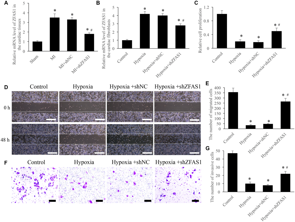 In order to investigate the role of ZFAS1 on MI, both in vivo and in vitro models were established. Significant increase of ZFAS1 in both MI and hypoxia models was observed (Figure 1A and 1B). However, knockdown of ZFAS1 remarkably decreased the level of ZFAS1 (Figure 1A and 1B). Meanwhile, the proliferation, migration, and invasion of CFs were significantly suppressed after hypoxia treatment (Figure 1C–1G). However, simultaneous treatment with shZFAS1 markedly reversed the influence of hypoxia treatment, promoted the proliferation, migration, and invasion ability of CFs (Figure 1C–1G). Therefore, ZFAS1 might act a key role during the process of MI.