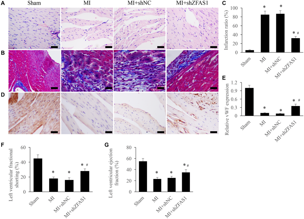 Morphological changes of heart tissues were investigated using Masson and HE staining. After treatment with MI and MI+shNC, disorder arrangement of cardiomyocytes and enlargement of tissues gap were observed (Figure 2A). Meanwhile, remarkable increase of myocardial fibrosis measured by Masson staining was found in the group MI and MI+shZFAS1 (Figure 2B). Infarction ratio was analyzed by measuring the intensity of collagen deposition. MI treatment significantly increased infarction ratio compared to group sham, but knockdown of shZFAS1 markedly reversed the effect of MI, and decreased the level of infarction ratio (Figure 2C). In addition, the level of vWF in the tissues was detected via IHC to investigate the changes of angiogenesis. Remarkable lower levels of vWF in the group MI and MI+shNC were observed, but shZFAS1 significantly promoted the expression of vWF compared to these two groups (Figure 2D and 2E). In addition, in group MI and MI+shNC, both left ventricular ejection fraction (LVEF) and left ventricular fractional shortening (LVFS) were remarkably inhibited compared with group sham (Figure 2F and 2G). Similarly, LVEF and LVFS were markedly increased by shZFAS1. These findings indicate that knockdown of ZFAS1 could improve MI.