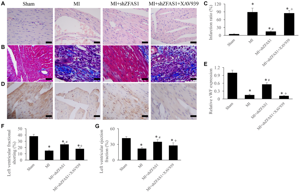 To further unfold the potential influence of ZFAS1 on Wnt/β-catenin pathway, the inhibitor of Wnt/β-catenin pathway, XAV939, was used in the animal experiment. We found that MI+shZFAS1 could significantly reversed the changing trends of cardiac tissues morphological changes, infarction ratio, vWF expression, LVEF, and LVFS in the group MI (Figure 4A–4G). However, after simultaneous treatment with XAV939, significant increase of infarction ratio, and decrease of vWF, LVEF, and LVFS were observed compared with group MI+shZFAS1 (Figure 4A–4G). Therefore, ZFAS1 might regulate the process of MI through targeting Wnt/β-catenin pathway.