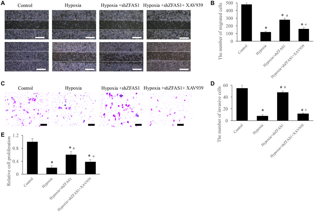The regulation of ZFAS1 on MI through Wnt/β-catenin pathway was further validated through in vitro experiments. We found that treatment with hypoxia+shZFAS1 significantly increased the migration, invasion, and proliferation ability of CFs compared to group hypoxia (Figure 5A–5E). However, treatment with hypoxia+shZFAS1+XAV939 remarkably inhibited the migration, invasion, and proliferation ability of CFs compared to group hypoxia+shZFAS1 (Figure 5A–5E). These findings further confirmed the conclusion that ZFAS1 might affect the process of MI via regulating Wnt/β-catenin pathway.