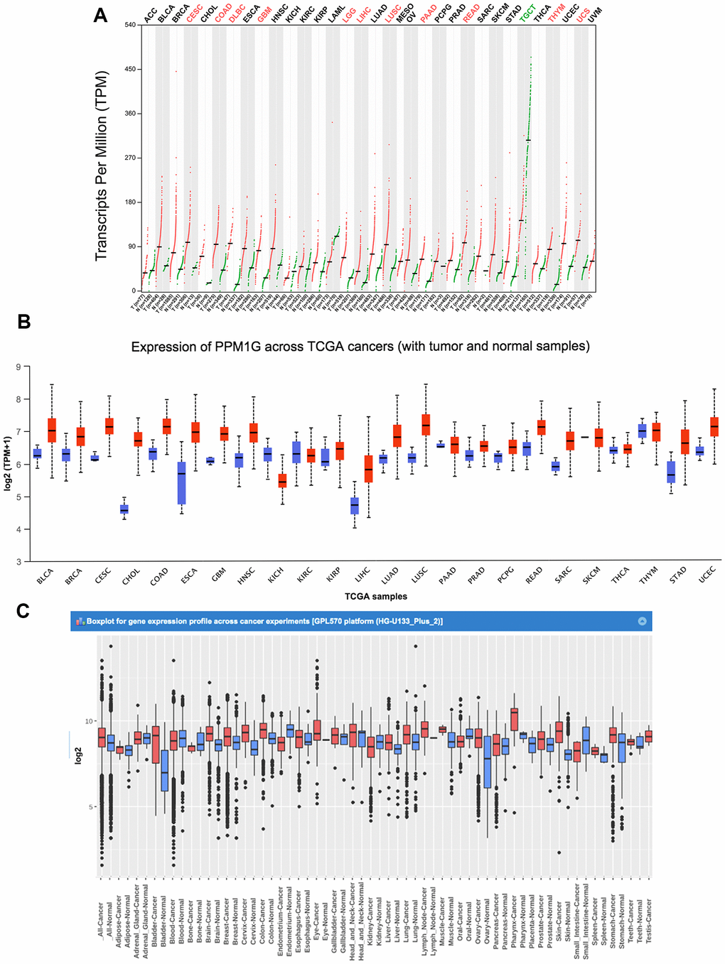 PPM1G expression profiles in various cancers were analyzed with the GEPIA database (http://gepia.cancer-pku.cn/) [43], UALCAN (http://ualcan.path.uab.edu) [44] and the GENT database (http://gent2.appex.kr/gent2/) [45]. GEPIA and UALCAN are based on TCGA data. In GEPIA, PPM1G expression in tumor samples in TCGA was compared to that in adjacent normal samples via Genotype-Tissue Expression (GTEx) [46]. GENT data comes from the GPL 570 clinical data from 29 cancer types of GEO database. Analyses were carried out with the default settings in all the above databases.
