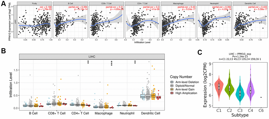 In recent years, increasing attention has been given to the tumor immune microenvironment, which has changed precision medicine therapy for cancer. The network of PPM1G AMP co-alterations was enriched in several immune functions. Therefore, we hypothesized that the expression of PPM1G might be linked to the tumor immune microenvironment in LIHC. We examined the immune microenvironment in which PPM1G is located. The results showed that PPM1G was significantly associated with tumor purity and the infiltration of dominant immune cells. The mechanism of PPM1G in the tumor immune microenvironment deserves further exploration. The outcome of immunotherapy for cancer mainly depends on the immune response mediated by T cells (which is affected by alternative splicing). Thus, the correlation between PPM1G expression and the function of T cells needs further confirmation.