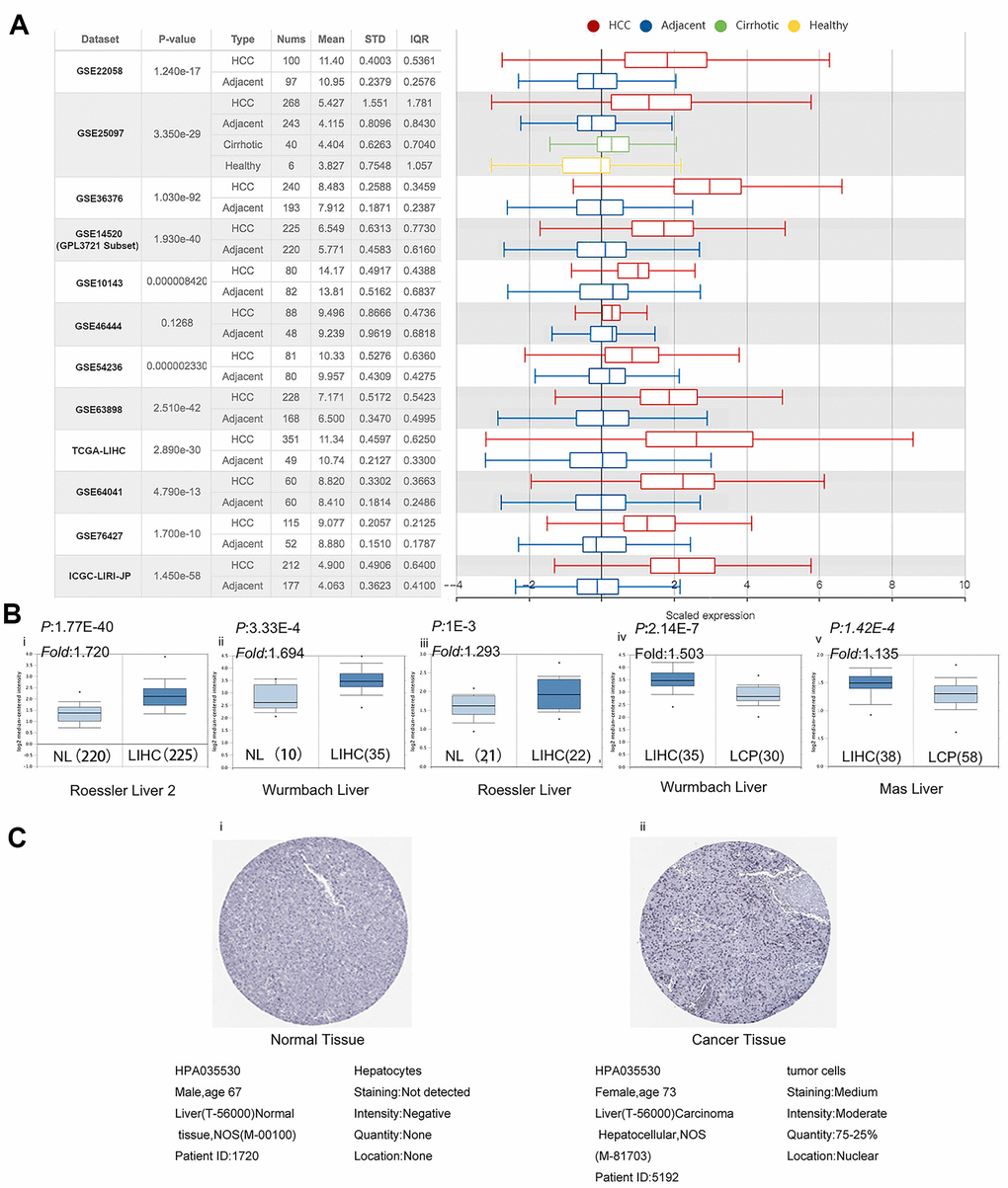The PPM1G transcription patterns in LIHC and normal liver tissues were compared via HCCDB (http://lifeome.net/database/hccdb/home.html) [47], Oncomine 4.5 (https://www.oncomine.org/) [48] and HPA (https://www.proteinatlas.org/) [49]. The HCCDB database includes data from GEO [50–52], TCGA and ICGC [53]. For the Oncomine analysis, the following thresholds were used: p-value of 1E-4, fold change of 1.5, and gene ranking of all. In the HPA database, PPM1G protein expression in LIHC and normal liver tissues was assessed in immunohistochemistry images.