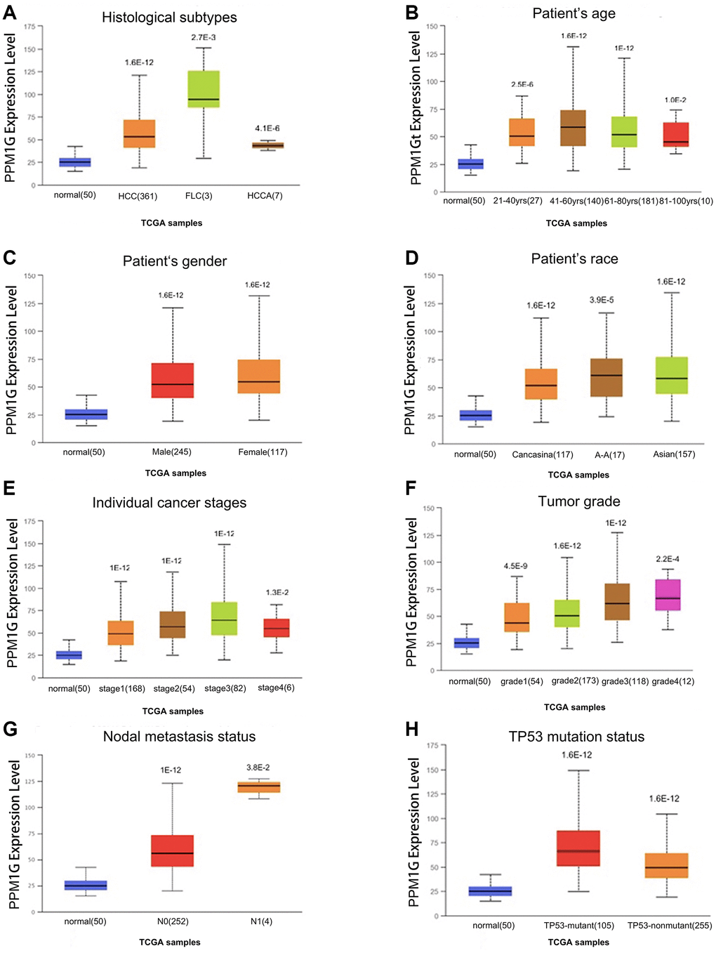 Furthermore, we analyzed the association between PPM1G expression and clinicopathological characteristics in the UALCAN database (using TCGA-LIHC data). The results showed elevated expression levels of PPM1G in LIHC patients compared with normal controls in subgroup analysis based on disease stage, grade, sex, age, race, histological subtype, and TP53 mutational status (Figure 3).