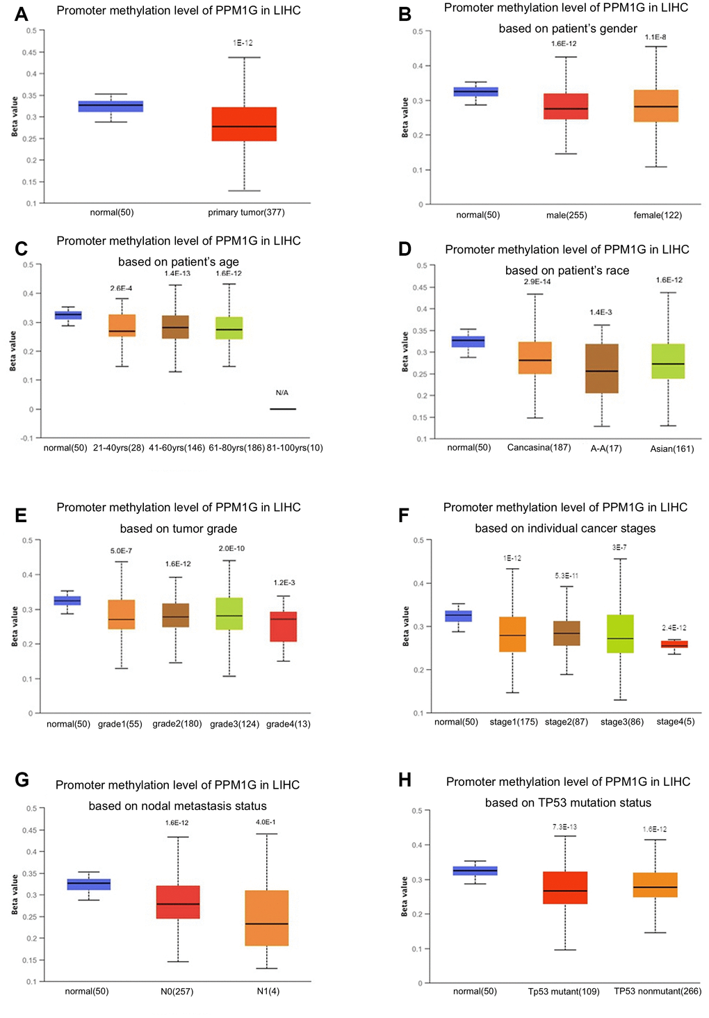 Promoter methylation is one of the most important regulatory factors of gene expression. Subgroup analysis of multiple clinicopathological features of TCGA-LIHC samples via the UALCAN database indicated that the promoter methylation of PPM1G was significantly lower in LIHC patients than in normal controls in subgroups based on stage, grade, sex, age, and ethnicity (Figure 4).