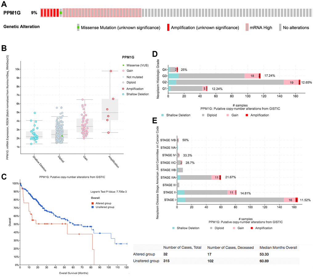 PPM1G mutations and CNVs were analyzed with TCGA samples by using cBioPortal datasets (http://cbioportal.org) [54]. Somatic copy number alterations (CNAs) were identified in RNA-seq data by the Genomic Identification of Significant Targets in Cancer (GISTIC) algorithm with the default settings, and mRNA expression data were plotted using the cBioPortal website. The OncoPrint plot displayed an overview of PPM1G genetic alterations per sample.