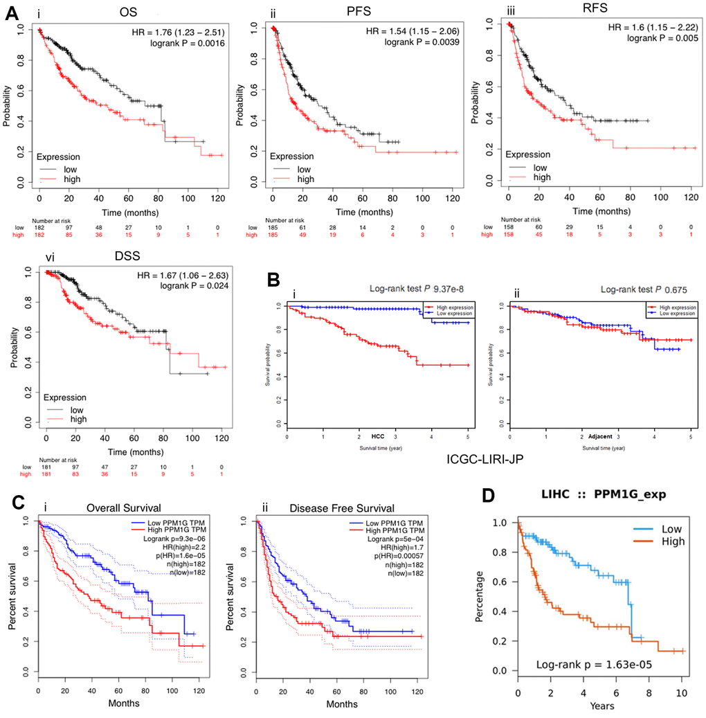 The associations between patient survival and PPM1G expression in LIHC were visualized via KM plotter (http://kmplot.com/analysis/) [55] (which uses TCGA, GEO, and EGA data), GEPIA(which uses TCGA data) [43] and TISIDB (http://cis.hku.hk/TISIDB/)(which uses TCGA data) [56], and the results were verified in HCCDB(which uses ICGC-LIRI-JP data) [47]. The KM plotter platform was used to quickly evaluate disease prognosis parameters, including OS, PFS, RFS and DSS, according to the median cutoff values.