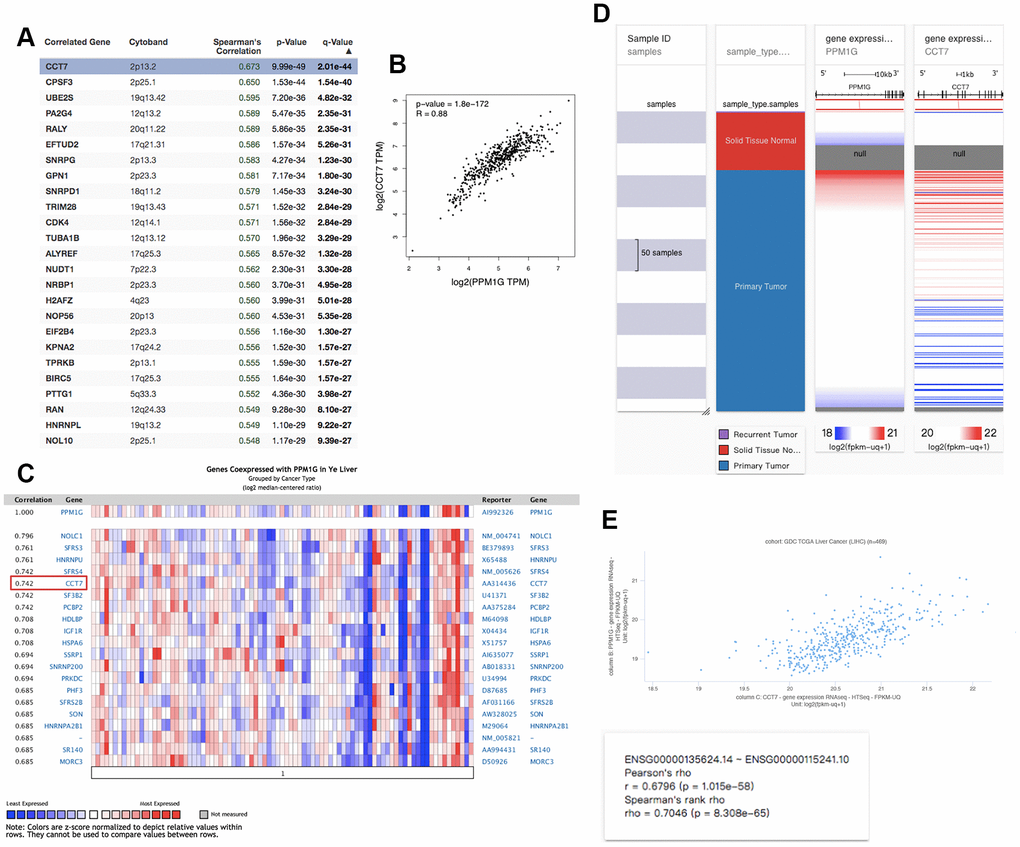 The top 25 PPM1G coexpressed genes were identified via cBioPortal [54]. Then, we used GEPIA, UCSC Xena (http://xena.ucsc.edu/) [57] and Oncomine (an idependent database, which is different from cBioPortal, GEPIA and UCSC) to verify the relationship between PPM1G and CCT7. UCSC Xena is a cancer genomics data analysis platform that supports the visualization and analysis of various omics data from cancer samples.