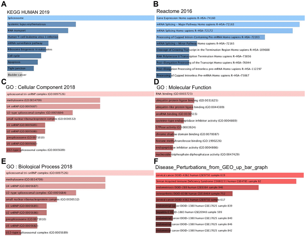 The PPM1G coexpressed genes were subjected to functional and pathway enrichment analyses with the Enrichr online tool (Figure 8). The top 10 Kyoto Encyclopedia of Genes and Genomes (KEGG) pathways were pathways related to spliceosomes, systemic lupus erythematosus, RNA transport, human T cell leukemia virus 1 infection, the mRNA surveillance pathway, ribosome biogenesis in eukaryotes, the cell cycle, apoptosis, and tight junctions. The top 10 REACTOME pathways were pathways related to gene expression, mRNA splicing, processing of capped introns, cleavage of the growing transcript in the termination region, RNA polymerase II transcription termination, post-elongation processing of the transcript, post-elongation processing of intronless pre-mRNA, and processing of capped intronless pre-mRNA. Next, GO analysis was used to determine the relevant biological processes, molecular functions, and cellular components. PPM1G and its positively correlated genes were mainly related to the spliceosomal tri-snRNP complex and RNA binding.