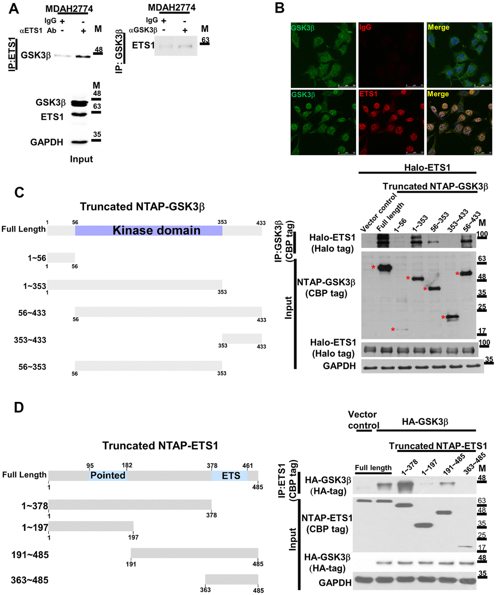 The potential interaction between ETS1 and GSK3β was investigated by means of immunoprecipitation. After pulling-down of endogenous ETS1 with a specific antibody, endogenous GSK3β was identified. Notably, we also observed an endogenous ETS1-GSK3β complex in ovarian cancer cell line (Figure 1A). Co-localization of the two proteins within cells was confirmed by confocal microscopy (Figure 1B). Serial truncated GSK3β and ETS1 constructs were used to map the interaction domains of ETS1 and GSK3β. The kinase domain of GSK3β (56-353/GSK3β) was found to be critical for the ETS1 interaction (Figure 1C). Interestingly, deletion of the central ETS1 region (1-197/ETS1 and 363−486/ETS1) reduced its interaction with GSK3β (Figure 1D). Altogether, these data indicate that 1) the kinase domain of GSK3β is responsible of its interaction with ETS1, 2) the central region of ETS1 (197−363) is necessary for its interaction with GSK3β.