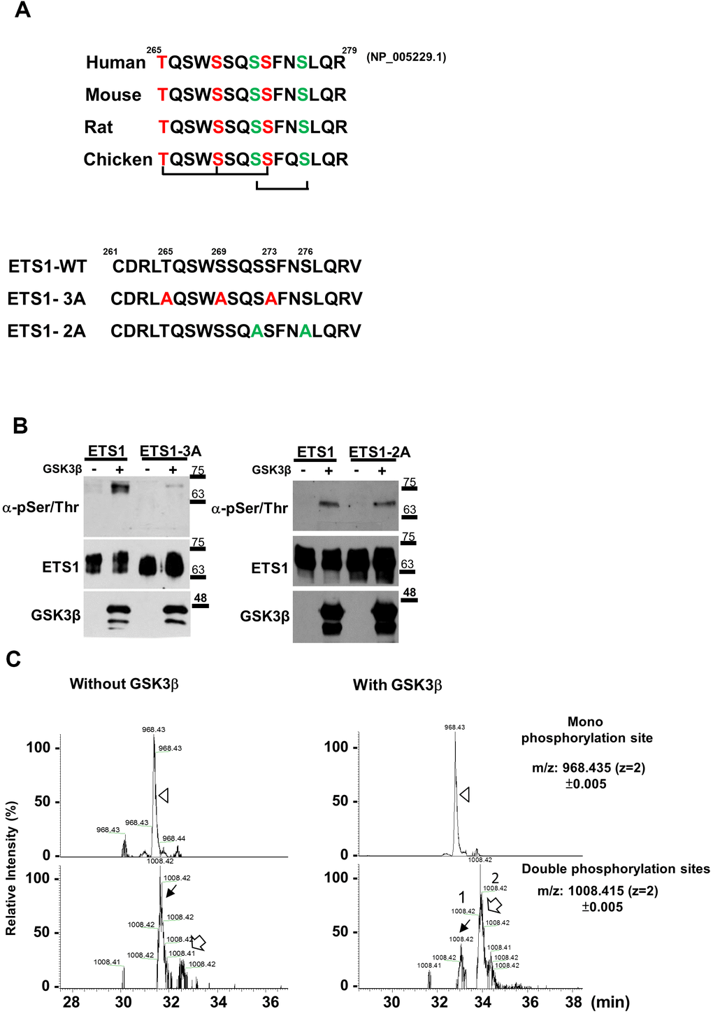 ETS1 has two potential GSK3β phosphorylation motifs (highlighted in red letters T265/S269/S273, and green letters, S272/S276, Figure 2A) [28]. To identify the GSK3β phosphorylation motifs in ETS1, we generated wild-type, triple mutant (ETS1-3A), and double mutant (ETS1-2A) ETS1 (Figure 2B) – which were subsequently purified and incubated with GSK3β and ATP. After probing with the anti-phospho-serine/threonine antibody on a SDS-denatured membrane, we found lower phospho-serine/threonine ETS1-3A levels compared with wild-type – although the extent of phosphorylation was similar for the ETS1-2A protein (Figure 2B).
