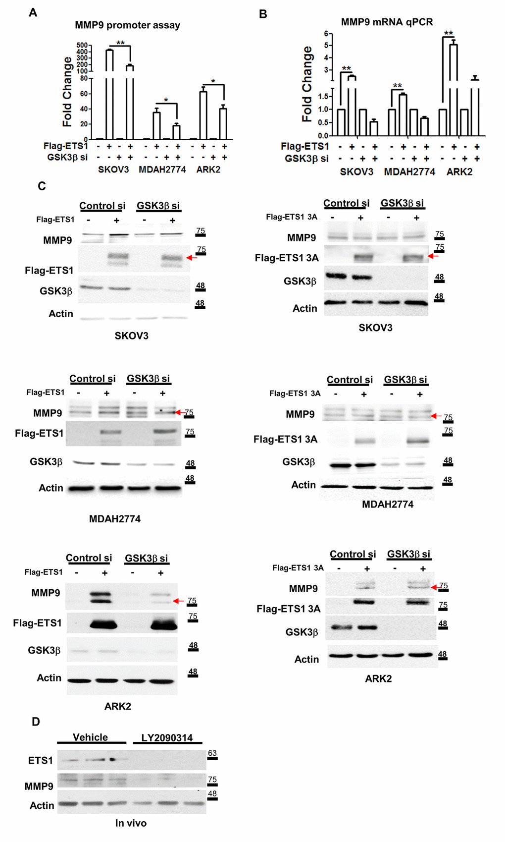 Because MMP-9 is one of the ETS1 downstream target genes [18], we investigated the extent to which ETS1 and ETS1-3A promoted MMP-9 transcriptional activity. First, we analyzed the MMP-9 promoter to identify ETS1 responsive regions. Overexpression of ETS1 was able to induce both MMP-9 protein and activity in ARK2 cells (Supplementary Figure 2A). After transfection with ETS1 and different truncated MMP-9 promoter constructs, ETS1 was found to induce a 10-fold increase in promoter activity when the -580 promoter construct was used (Supplementary Figure 2B). All of the subsequent experiments were therefore performed with this construct. To confirm the role of GSK3β in promoting MMP-9 expression, we examined its induction in cancer cells co-transfected with the ETS1 expression vector and GSK3β siRNA. Silencing of endogenous GSK3β was found to block MMP-9 promoter activity (Figure 4A), as well as its mRNA (Figure 4B) and protein (Figure 4C) expression. The induction levels of MMP9 in overexpressed ETS1-3A cell lines showed no difference in the absence or presence of GSK3β siRNA (Figure 4C). Because we have previously shown that LY2090314 can inhibit murine ovarian cancer-MOSEC cells growth [31], we also examined the endogenous ETS1 and MMP-9 protein levels in the same experimental tumors of LY2090314-treated mice. LY2090314 was found to inhibit both ETS1 and MMP-9 protein expression (Figure 4D).