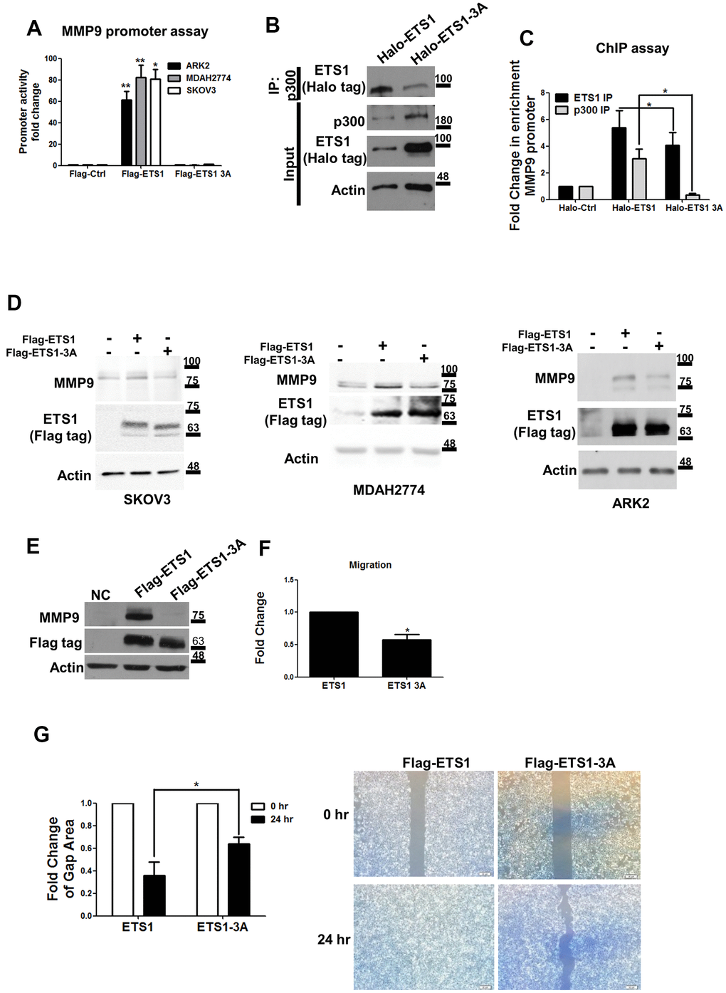Furthermore, wild-type ETS1, but not ETS1-3A, was able to induce MMP-9 promoter activity in ARK2, MDAH2774, and SKOV3 cells (Figure 5A). p300 is a histone acetyltransferase which is able to bind ETS1 to serve as a transcription coactivator [32, 33]. To shed more light on the potential role of p300 in ETS1-mediated MMP-9 regulation, the interaction of p300 with ETS1 and ETS1-3A was examined. ETS1-3A was found to interact with p300 at a lesser extent than ETS1 (Figure 5B). In addition, ETS1-3A had a lower capacity to bind the MMP-9 promoter (MMP9 promoter -166 region in Supplementary Figure 2B) compared with ETS1. Results of chromatin immunoprecipitation experiments revealed that a lower amount of p300 was recruited by ETS-3A on the MMP-9 promoter region (Figure 5C). MMP-9 induction was less prominent in ETS1-3A-overexpressing cancer as compared with that observed when ETS1 was overexpressed (Figure 5D).