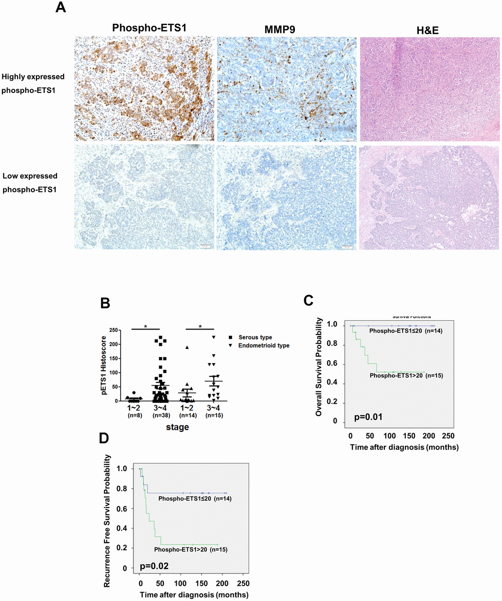 We also analyzed phospho-ETS1 and MMP-9 in ovarian cancer tissues. The results revealed that MMP-9 expression was higher in tissue areas characterized by high phospho-ETS1 expression (Figure 6A, upper panel) as compared with areas showing lower phospho-ETS1 expression (Figure 6A, lower panel). Moreover, advanced serous and endometrioid ovarian malignancies were characterized by a high phospho-ETS1 expression (reflecting the results obtained in SKOV3 and MDAH2774 cells, respectively (Figure 6B). Kaplan-Meier analysis revealed that the cumulative overall survival (Figure 6C) and recurrence-free survival (Figure 6D) of patients with a phospho-ETS1 histoscore ≤ 20 were significantly higher than those cases with scores >20 in endometrioid type ovarian cancer – suggesting that it may serve as a prognostic biomarker in this malignancy.