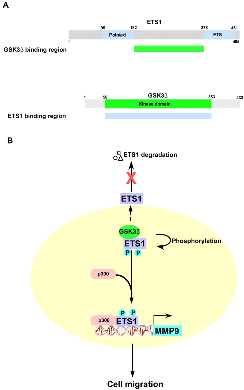 Taken together, these results indicate that ETS1 phosphorylation catalyzed by GSK3β can promote its interaction with p300 and induce the expression of MMP-9 as a downstream target gene.