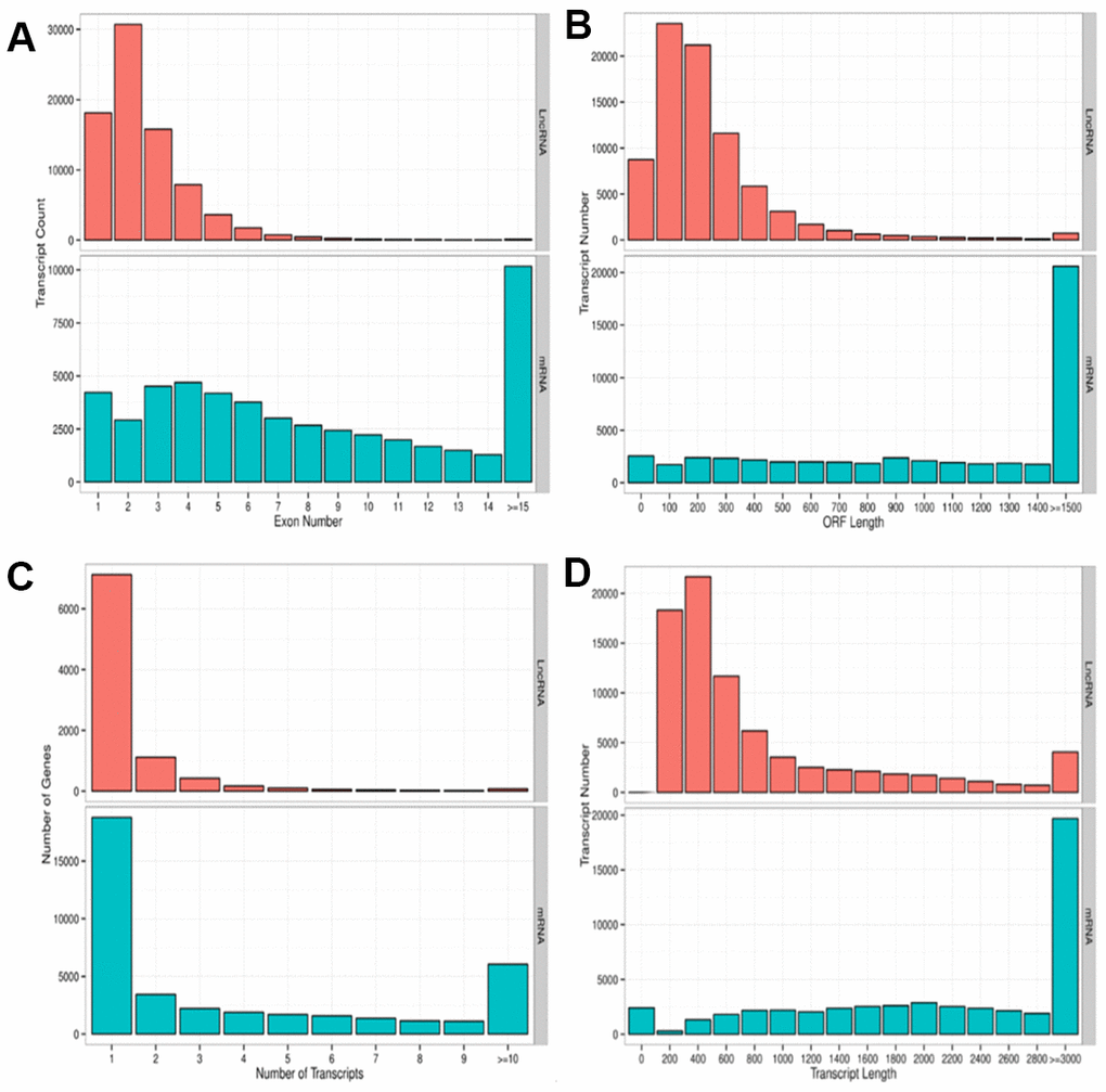 We performed a high-throughput whole transcriptome shotgun sequencing to compare the sperm RNA expression patterns between NS and OS groups. We extracted high-quality RNA from each sperm sample and constructed cDNA libraries. Next, we calculated the levels of transcripts of lncRNAs and mRNAs on an Illumina HiSeq X-Ten Platform, which supported a read length of 2 × 150 bp with quality scores of ≥ 75% of bases above Q30. After filtering the raw data, 24.4 to 79.8 million clear reads and 2,501 lncRNAs and mRNAs were identified distribution of base composition and distribution of quality are shown in Figure 2. Figure 2 shows the characteristics of identified lncRNAs and mRNAs. The lncRNA transcripts were shorter in length (Figure 2D) and contained fewer exons than mRNAs (Figure 2A). The majority of identified lncRNAs contained one to two transcripts, whereas most mRNAs had one to four transcripts (Figure 2C)—findings that are in agreement with those of previous studies [30–32]. The length of open reading frames (ORFs) of mRNAs was shorter than that of lncRNA ORFs (Figure 2B).