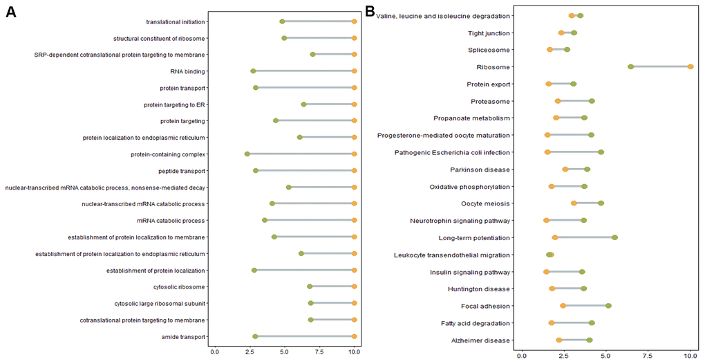We next performed GO and KEGG pathway enrichment analyses to study the functions of DE genes corresponding to DE mRNAs and DE lncRNAs. Over-representation (ora) GO analysis revealed 777, 196, and 188 terms enriched in biological processes (BP), cell components (CC), and molecular functions (MF), respectively. Similar results were obtained in the pathway-level analysis (plage). These GO terms were primarily related to intracellular protein transport and localization. GO terms with the highest differential expression were enriched in SRP-dependent co-translational protein targeting to the membrane, co-translational protein targeting to the membrane, and protein targeting to the ER (Figure 5A). Table 4 lists the DE genes associated with these processes, including CHMP4B, SEC61A1, SEC61A2, SEC61G, SEC62, SGTB, SPCS1, SRP9, SRP19, RYR2, ANK2, DDRGK1, INSIG1, KDELR2, RER1, and RTN4. Furthermore, differential GO terms were enriched in ER stress, oxidative stress, protein unfolding, and cell apoptosis (Figure 5B, Supplementary Table 7). Twenty-six over-represented GO terms were directly related to negative regulation of response to ER stress (Supplementary Table 7). In the case of protein unfolding, unfold protein binding had a significant difference (Supplementary Table 7). Five GO terms were related to oxidative stress, including neuron death in response to aerobic stress, negative regulation of aerobic stress-induced intrinsic acoustic signaling pathway, positive regulation of aerobic-stress induced intrinsic acoustic pathway, and regulation of oxidative stress-induced neuron death (Supplementary Table 7). Other apoptosis GO terms were those involved in the negative regulation of apoptosis (Supplementary Table 7).