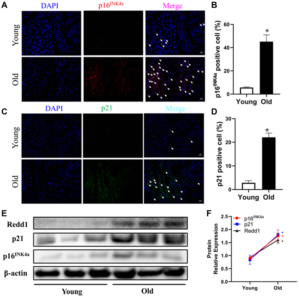 Cellular senescence, considered a hallmark of organismal aging, is characterized by elevated expression of senescence marker genes [29]. To investigate the effect of aging on cardiac cell senescence, the expression of two senescence-related cell-cycle regulators (i.e., p16INK4a and p21) was evaluated in heart tissues from young (3–4 months old) and old (24 months old) male C57BL/6 mice. While p16INK4a and p21 expression was barely detectable in heart tissues from young mice, extensive immunoreactivity was observed for both markers in aged heart tissues (Figure 1A–1D). Accompanying these changes, the expression of Redd1 was also clearly increased in the hearts of older, but not young, animals (Figure 1E and 1F). These data suggest that Redd1 may be involved in the process of cardiac aging.