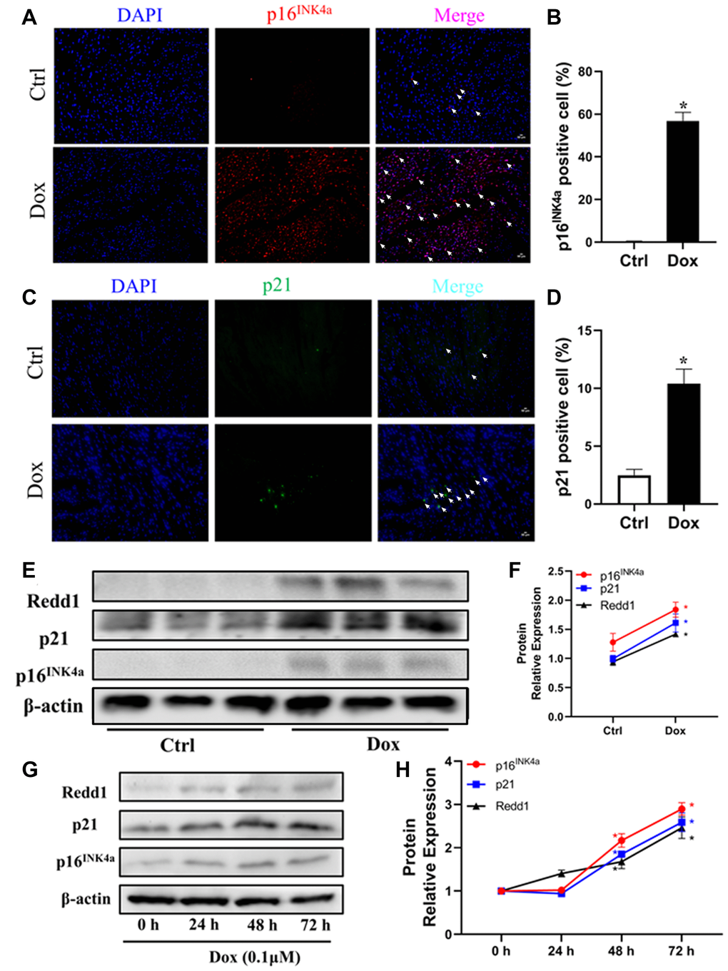 To further elucidate the relationship between Redd1 expression and cardiac senescence, we examined potential changes in cardiac Redd1 expression in a mouse model of Dox-induced cardiomyopathy. Immunolabeling and western blot assays showed that the expression of p16INK4a, p21, and Redd1 was significantly increased in myocardial tissues from young adult mice exposed to a 2-week Dox regimen (Figure 2A–2F). To verify these data, we next administered Dox to rat H9c2 cardiomyocytes in vivo to induce a senescence phenotype. Consistent with the results obtained in vivo, at a relatively low dose of 0.1 μM, increased expression of p16INK4a, p21, and Redd1 suggested effective induction of a senescent phenotype in Dox-treated cardiomyocytes (Figure 2G and 2H). These data indicated that Redd1 overexpression parallels characteristic senescence-related molecular changes induced by either physiological aging or Dox.