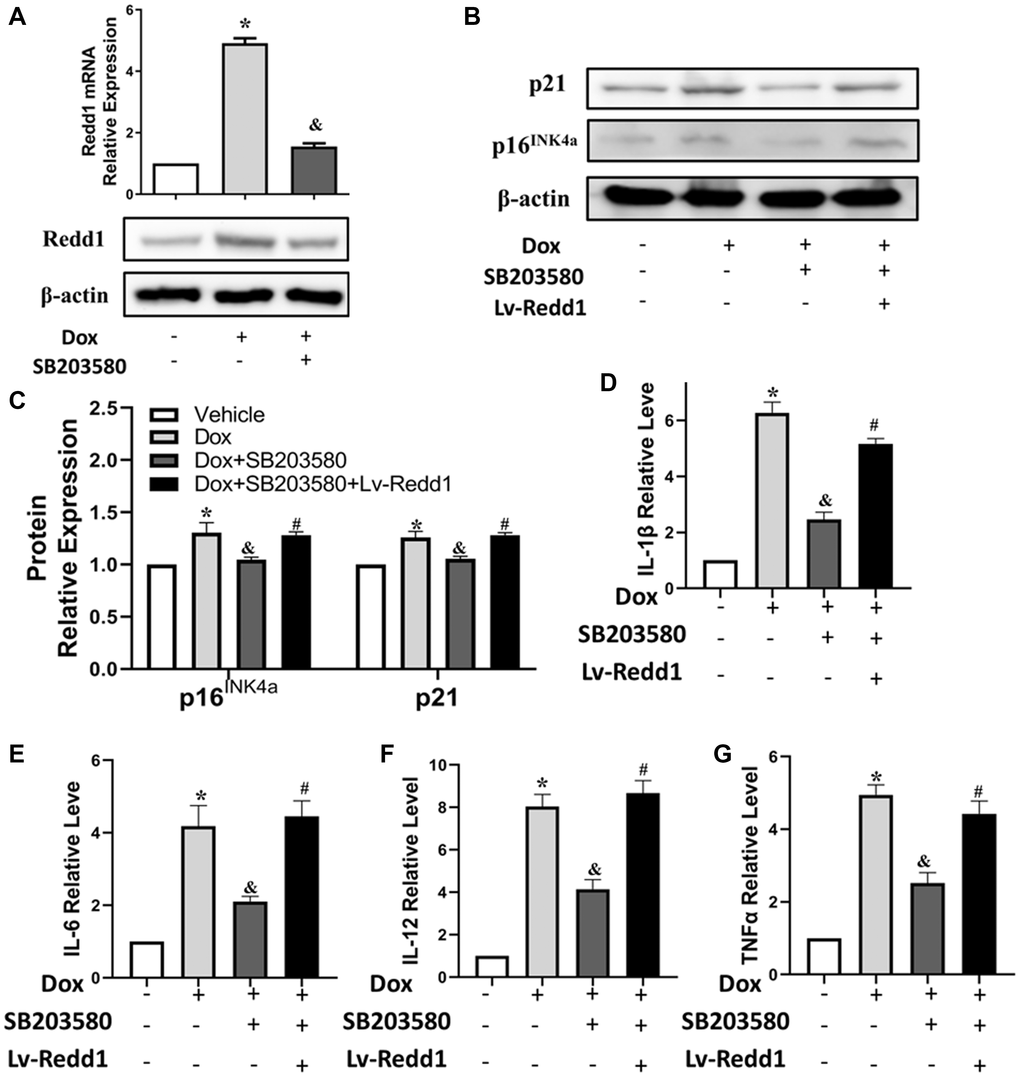 Dox acts through multiple pathways leading to cardiomyocyte senescence. Based on previous findings linking p38 MAPK activity with both Dox-induced cardiomyocyte senescence [30] and Redd1 expression [31], we tested the effect of SB203580, a highly selective p38 MAPK inhibitor, on Redd1 expression in Dox-treated H9c2 cardiomyocytes. As shown in Figure 4A, pretreatment with SB203580 (2 μM) completely abrogated Dox-induced Redd1 upregulation. Furthermore, the expression of both p16INK4a and p21 was also blunted by pre-exposure to the p38 MAPK inhibitor, and partly rescued by concomitant transduction with Lv-Redd1 to achieve Redd1 overexpression (Figure 4B and 4C). Subsequently, qPCR analysis was performed to assess the effect of p38 MAPK inhibition on the cardiomyocytes’ SASP. As illustrated in Figure 4D–4G, SB203580 almost fully reversed the significant increase in SASP-related cytokines induced by Dox. However, the effect of SB203580 was abolished after transduction of H9c2 cells with Lv-Redd1. These results suggest that p38 MAPK acts as an upstream activator of Redd1 during Dox-induced senescence in cardiomyocytes.
