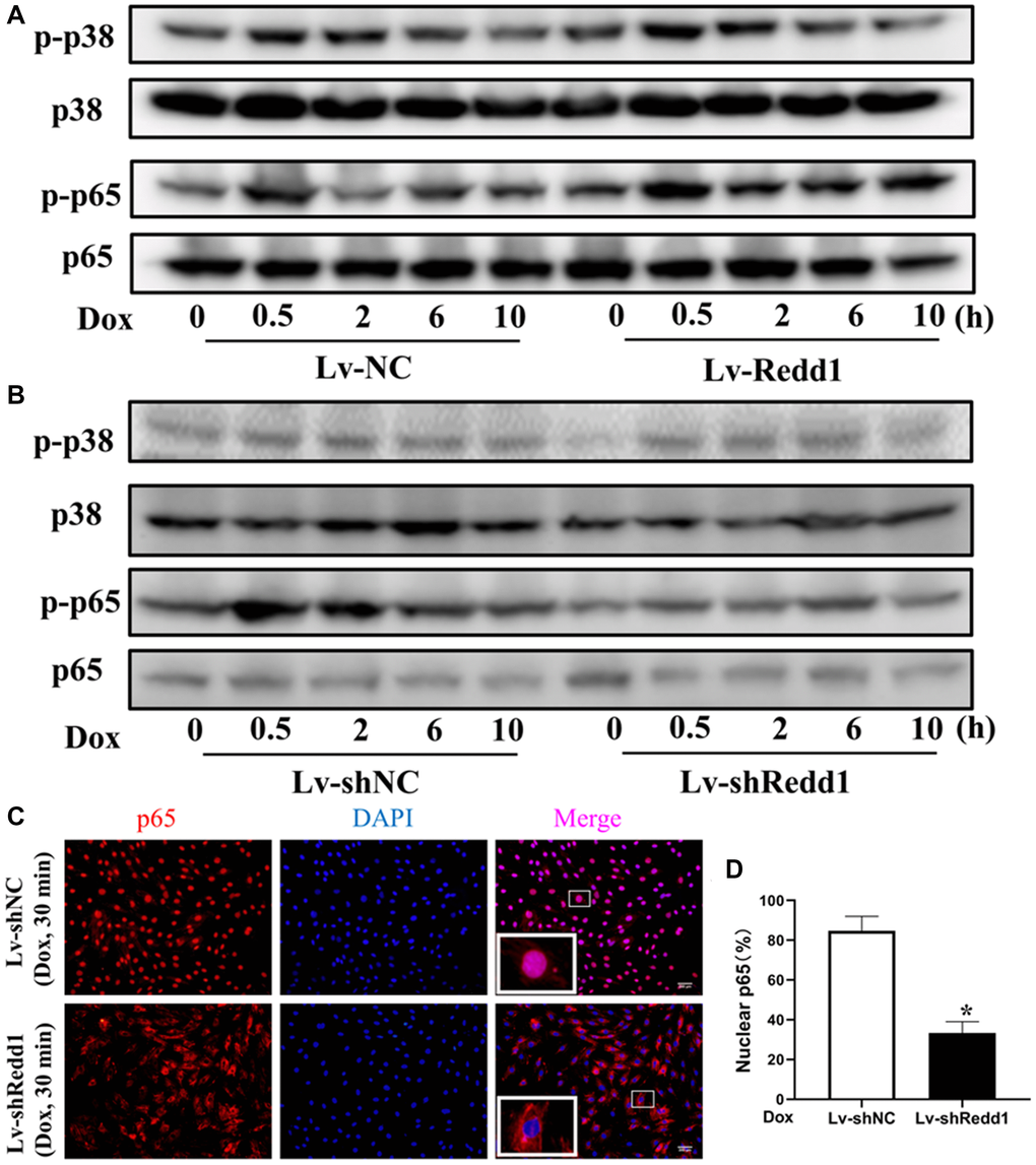 Considering the major contributions of the NF-κB and p38 MAPK pathways to the mechanisms determining cellular senescence responses, we next examined the impact of Redd1 expression on the phosphorylation of critical signaling proteins within these pathways. As shown in Figure 5A and 5B, the phosphorylation status of p65 and p38 was enhanced in H9c2 cells subjected to 30-min Dox incubation. After Redd1 silencing or overexpression, the phosphorylation of p65, but not p38, was affected. Specifically, Redd1 overexpression markedly increased p65 phosphorylation (Figure 5A and 5B), whereas immunofluorescence assays indicated that Redd1 silencing inhibited Dox-induced p65 nuclear translocation (Figure 5C and 5D). Collectively, these data suggest that Redd1 acts as a positive regulator of the NF-κB signaling pathway to promote a senescence-associated phenotype in cardiomyocytes.