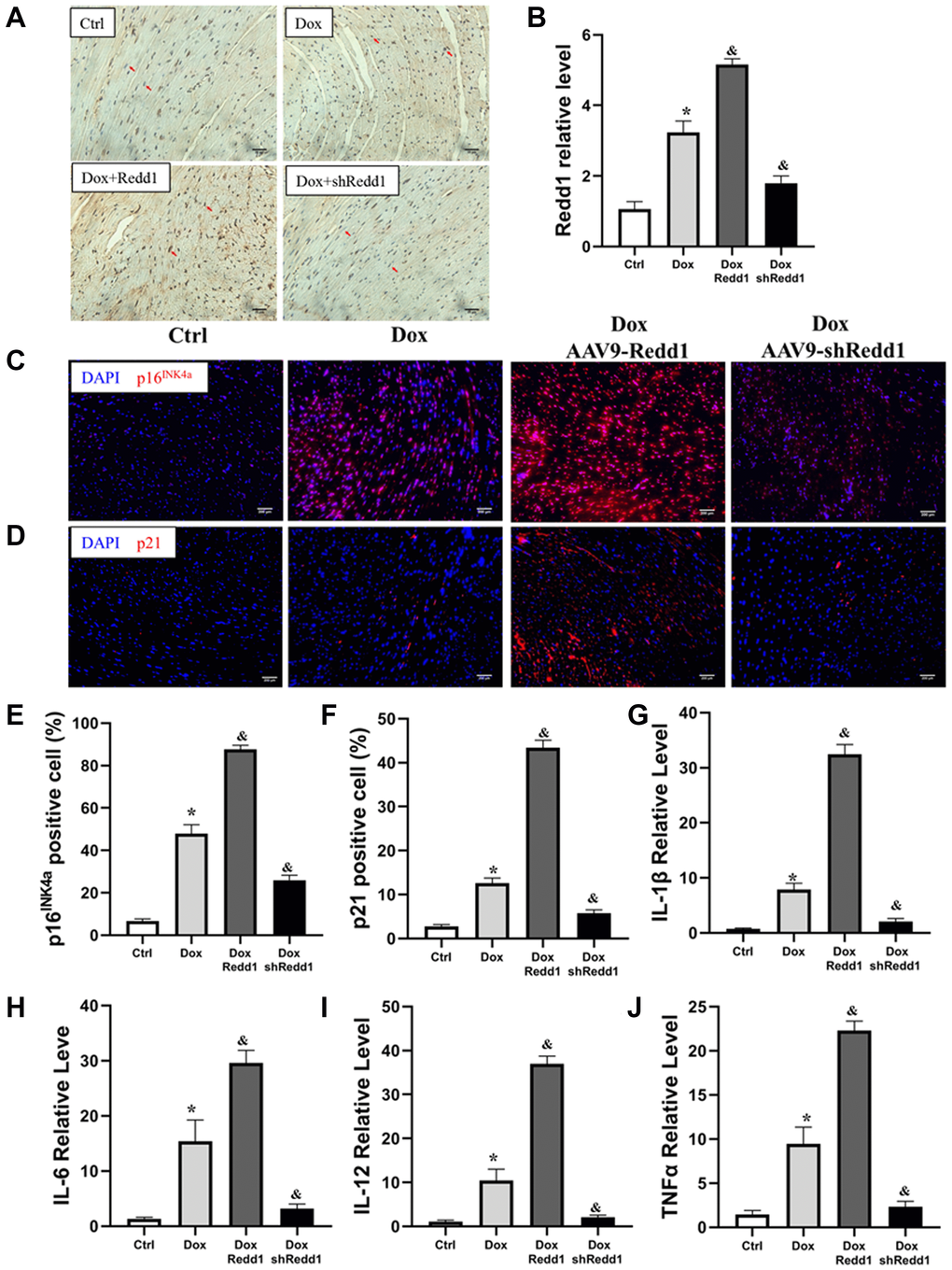 To define the role of Redd1 in Dox-induced cardiomyocyte senescence in vitro, we applied a lentivirus (Lv)-based approach to modify the expression of Redd1 in cultured rat H9c2 cardiomyocytes. Predictably, SA-β-gal staining was significantly elicited in Dox-treated cardiomyocytes and was further enhanced by Lv-Redd1-mediated upregulation of Redd1 (Figure 3A and 3B). By contrast, downregulation of Redd1 expression via transduction with Lv-shRedd1 partly abrogated the increase in SA-β-gal staining. Paralleling these changes, Redd1 overexpression and silencing increased and decreased, respectively, Dox-induced expression of p16INK4a and p21 (Figure 3C–3F). To further verify the role of Redd1 in cardiomyocyte senescence, we assessed the SASP of Dox-treated H9c2 cells by quantifying mRNA levels of IL-1β, IL-6, IL-12, and TNFα. As shown in Figure 3G–3J, the expression of these pro-inflammatory cytokines was remarkably increased by Dox treatment. In line with the findings described so far, the SASP was exacerbated and attenuated, respectively, by upregulation and repression of Redd1. These results revealed that Redd1 plays a vital role in promoting Dox-induced premature senescence in cardiomyocytes.
