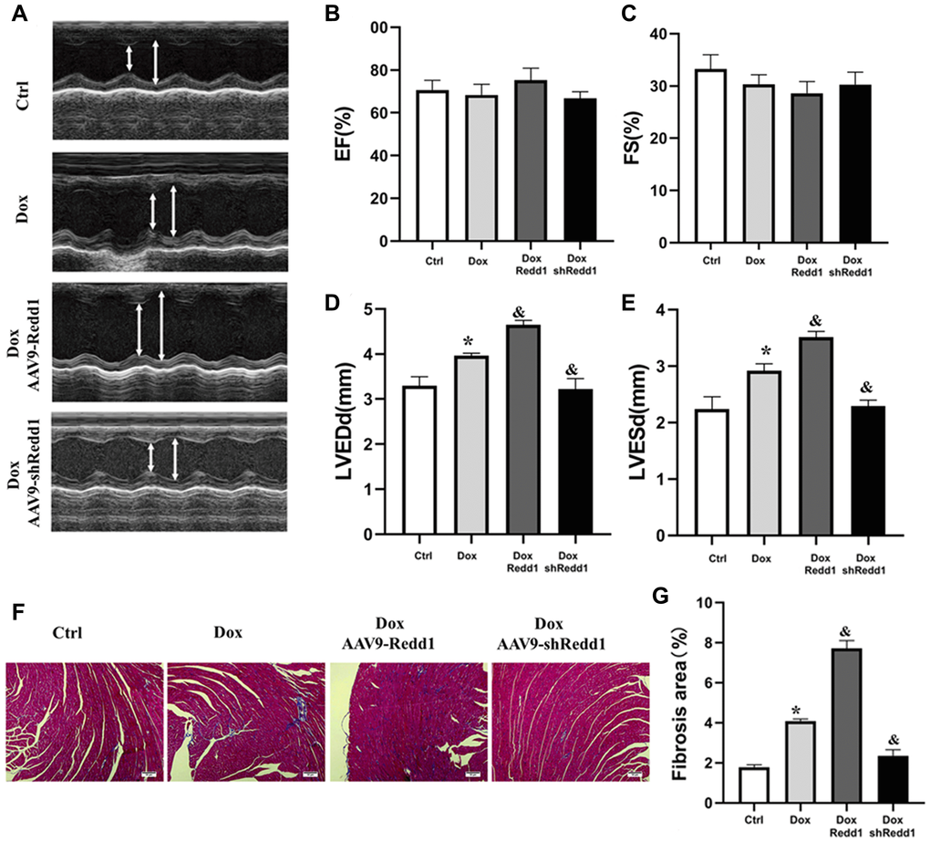 Next, we sought to determine whether altering Redd1 expression could modulate cardiac function in Dox-treated mice. To this end, echocardiography images were obtained to observe changes in left ventricular systolic and diastolic function (Figure 7A). In Dox-treated mice, left ventricular end diastolic diameter (LVEDd) and left ventricular end-systolic diameter (LVESd) were significantly increased, whereas left ventricular ejection fraction (LVEF) and left ventricular fractional shortening (LVFS) showed no obvious change (Figure 7B and 7C). In turn, both LVEDd and LVESd were further augmented by AAV9-Redd1 and decreased instead by AAV9-shRedd1 administration (Figure 7D and 7E). In parallel experiments, alterations in cardiac function were also confirmed in aged mice (Supplementary Figure 1). To evaluate whether cardiac fibrosis was also impacted by Redd1 expression, we examined collagen expression in heart samples using Masson’s trichrome staining. The results showed that Dox treatment increased collagen deposition in the heart, and this effect was enhanced and attenuated, respectively, by Redd1 overexpression and knockdown (Figure 7F and 7G). These results demonstrated that increased Redd1 expression contributes to Dox-mediated cardiac dysfunction and suggest that strategies aimed at decreasing endogenous cardiac Redd1 levels may help preserve normal functioning in the aged heart.