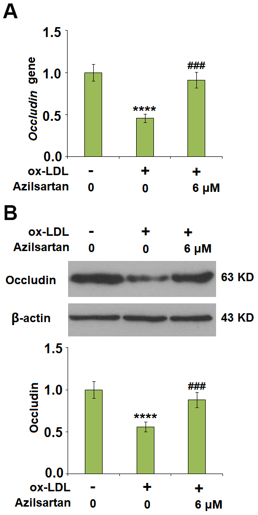 The endothelial monolayer permeability of HUVECs was evaluated using the FITC-dextran permeation assay. As shown in Figure 5, the endothelial monolayer permeability of HUVECs incubated with blank medium, ox-LDL, ox-LDL in the presence of 3 μM Azilsartan, and ox-LDL in the presence of 6 μM Azilsartan were 19.5%, 75.3%, 52.1%, and 41.6%, respectively. To further explore the mechanism, the expression level of occludin, a tight-junction protein, was determined. As shown in Figure 6, cells were stimulated with ox-LDL (100 μg/mL) in the presence or absence of Azilsartan (6 μM) for 24 hours. We found that occludin was significantly downregulated by stimulation with ox-LDL but was greatly reversed by treatment with Azilsartan, indicating a promising repairment of Azilsartan against injured tight junction.