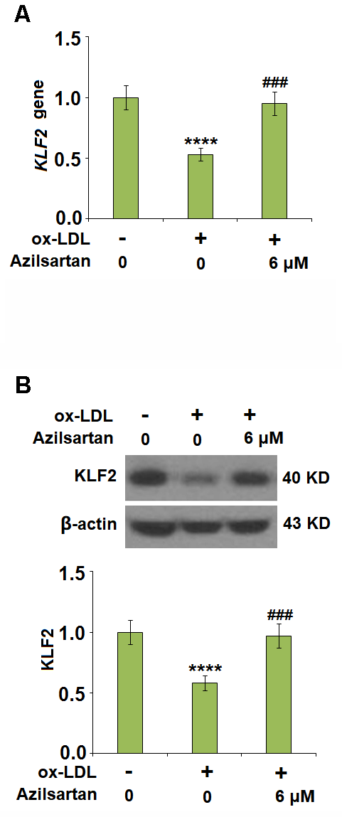 Taken together, our data show that Azilsartan might ameliorate ox-LDL-induced endothelial dysfunction via elevating the expression of KLF2.