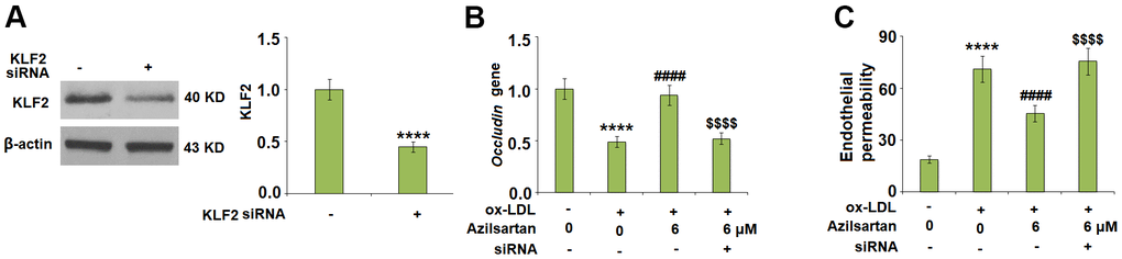 To explore the potential molecular mechanism, we focused on the key regulator-KLF2. As shown in Figure 7, we found that the expression level of KLF2 in HUVECs was significantly suppressed by the introduction of ox-LDL but was greatly elevated by treatment with Azilsartan. To verify the function of KLF2 that mediates the effects of Azilsartan, we knocked down the expression of KLF2 by transfecting the HUVECs with siRNA against KLF2. Results in Figure 8A display the successful knockdown of KLF2. Subsequently, the transfected cells were stimulated with ox-LDL in the presence of Azilsartan. As shown in Figure 8B, the suppressed expression of occludin induced by ox-LDL was significantly elevated by treatment with Azilsartan but reversed by the knockdown of KLF2. Further, the endothelial monolayer permeability of HUVECs incubated with blank medium, ox-LDL, ox-LDL in the presence of Azilsartan and KLF2 siRNA were 18.8%, 71.2%, 45.3%, and 75.6%, respectively, indicating that the silencing of KLF2 abolished the effects of Azilsartan on occludin expression and endothelial permeability.