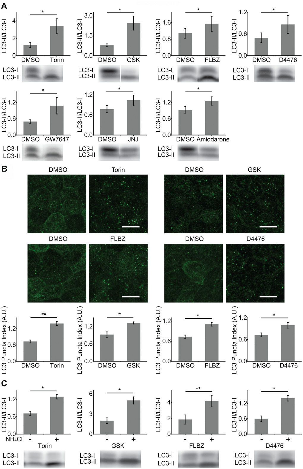 Autophagy induction was confirmed by assaying for the formation of LC3-positive puncta (autophagosomes) by immunocytochemistry [45]. Puncta formation was quantified in automated/unbiased fashion using a previously published customized macro in the Fiji/ImageJ platform [44]. Besides Torin and GSK, only two compounds, D4476, a casein kinase 1 inhibitor, and FLBZ, an FDA-approved anti-helminthic, also induced autophagy by this second assay (Figure 1B).