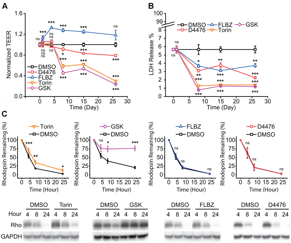 In evaluating autophagy inducers in the RPE, we found that mTOR inhibition disrupted RPE-specific functions, including tight-junction integrity, OS phagocytosis, and pigmentation. The role of mTOR in RPE health is multifaceted. On the one hand, over-activation of mTOR leads to RPE dedifferentiation through an epithelial-to-mesenchymal transition [80]. mTOR activation is also associated with RPE senescence [81] and less efficient phagocytosis of OS [82]. On the other hand, timely activation of mTOR and upstream kinases during OS ingestion is integral to coordinated phagocytosis [35, 36, 83], and activation of mTOR may be important for RPE survival under stress [84]. Given the deleterious effects of mTOR inhibition on RPE function in our primary culture system, we propose that the RPE requires a careful and time-dependent balance between mTOR activating and deactivating signals. Direct or immediate upstream modulation of mTOR may not, therefore, be therapeutically tractable.