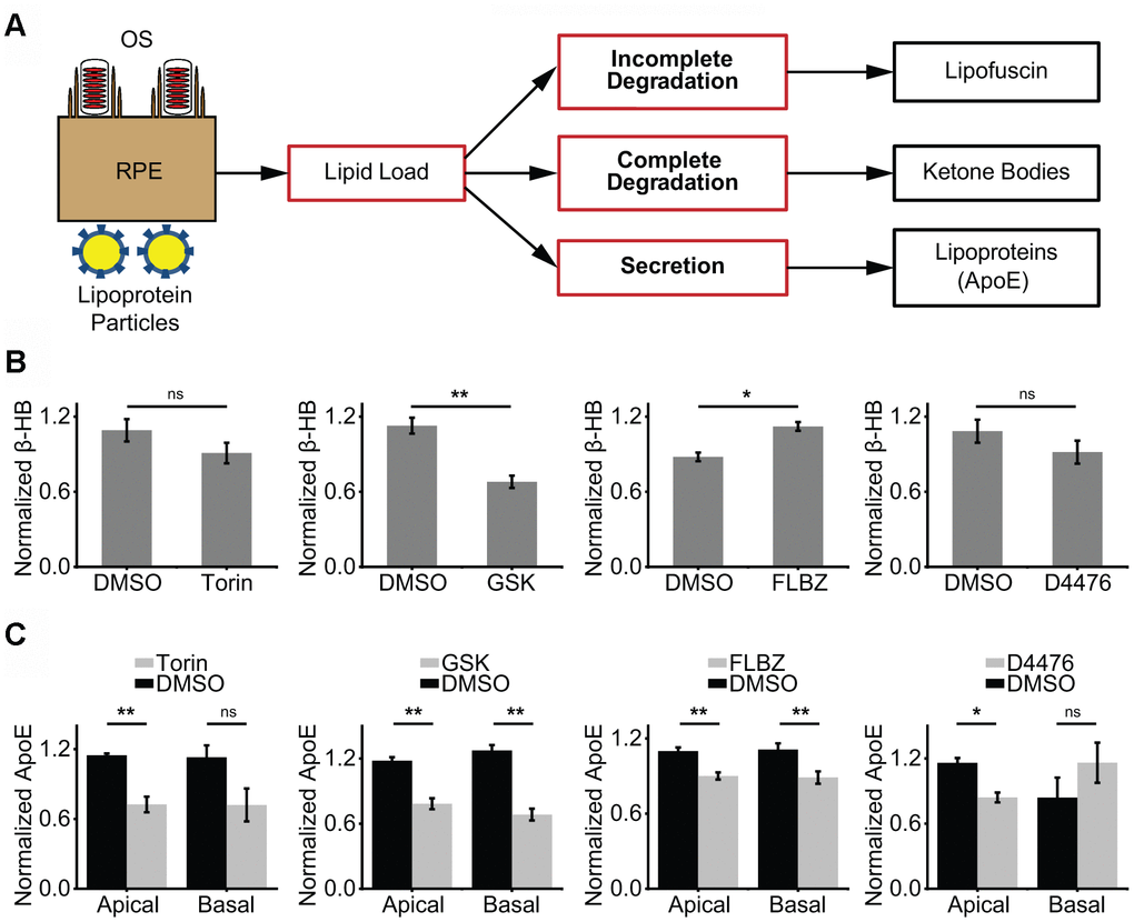 The RPE handles an enormous lipid burden on a daily basis, including OS ingestion from its apical side and lipoprotein particle absorption from its basolateral side. Rather than storing excess lipid, the RPE may choose to degrade or secrete surplus lipids (Figure 3A). A marker of lipid degradation is the production of KBs, which are secreted by the RPE apically and serve as an energy source for photoreceptors [8, 9]. A marker of lipid secretion is the production of the apolipoprotein, apoE, which is a major component of drusen [71]. We hypothesized that autophagy inducers may promote ketogenesis through degradation of ingested lipids, reducing the stimulus for secretion of drusen-promoting apoE. In our primary RPE cultures, only FLBZ both increased production of the major KB, β-hydroxybutyrate (β-HB), and reduced the apical and basolateral secretion of apoE, suggesting that FLBZ-mediated autophagy induction changes the lipid-handling profile of RPE away from drusen promotion (Figure 3B, 3C).