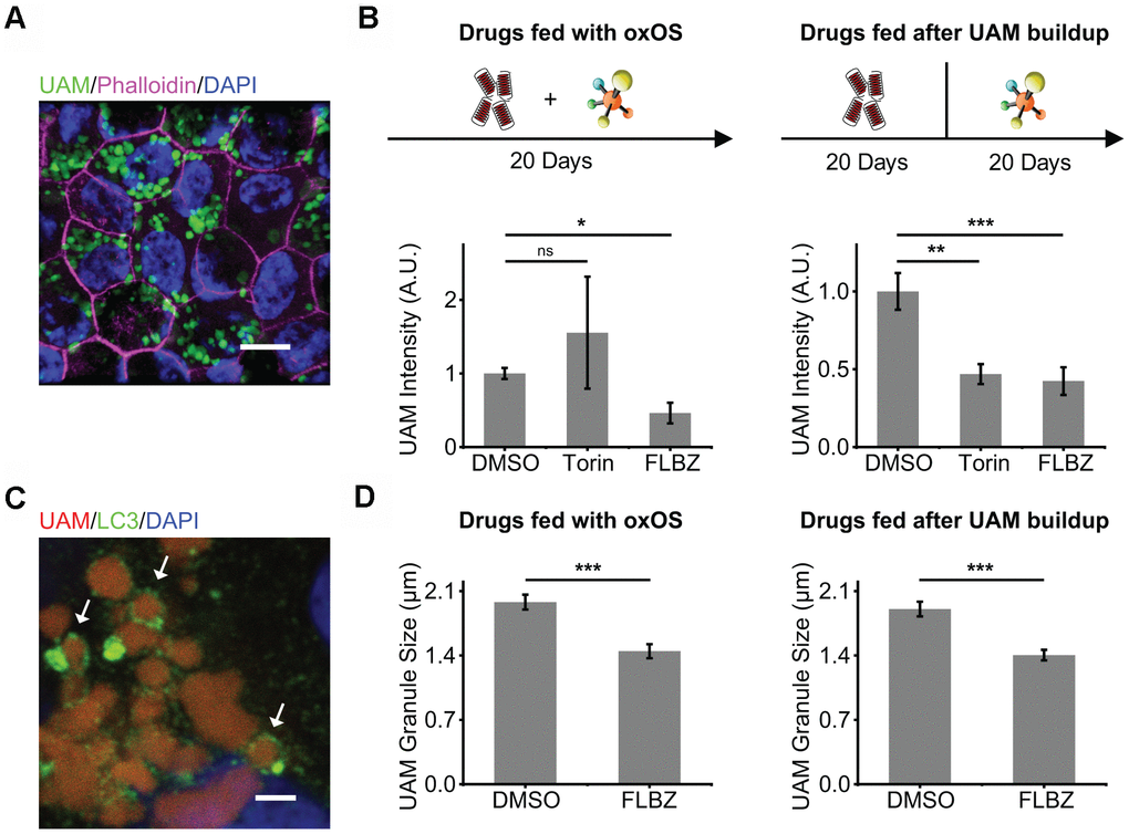 The concurrent feeding of oxOS and FLBZ at 12μM over the course of a month resulted in significantly less UAM accumulation compared to feedings of oxOS plus vehicle (Figure 4B). Since FLBZ has no effects on phagocytosis efficiency (Figure 2C), this reduction in UAM accumulation was not due to less uptake of oxOS in the FLBZ group. We also saw LC3 colocalization with UAM granules, supporting a role of autophagy in clearing UAM (Figure 4C). Remaining UAM granules in FLBZ-treated cultures were smaller than untreated cultures (Figure 4D). In contrast, treatment with Torin at 1μM over the course of a month resulted in more UAM accumulation (Figure 4B), possibly due to inhibitory effects of Torin on phagocytic degradation (Figure 2C).