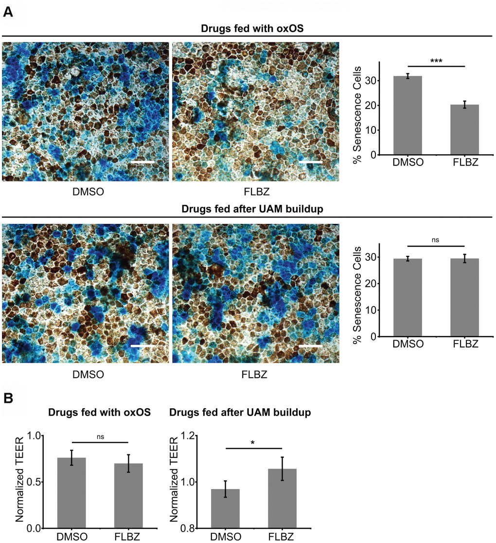 We and others have shown that cultures with a high UAM burden demonstrate significant senescence [72, 73], which in the RPE can contribute to the para-inflammatory state characteristic of AMD [74]. Cofeeding cultures with oxOS and FLBZ resulted in less senescence compared to feeding of oxOS plus vehicle (Figure 5A). Interestingly, when we treated cultures with FLBZ after UAM had already accumulated, cell senescence was not decreased, suggesting that established RPE senescence may be difficult to reverse (Figure 5A). Nevertheless, FLBZ still improved cell health, as assessed by tight-junction integrity, in cultures with already established UAM (Figure 5B).
