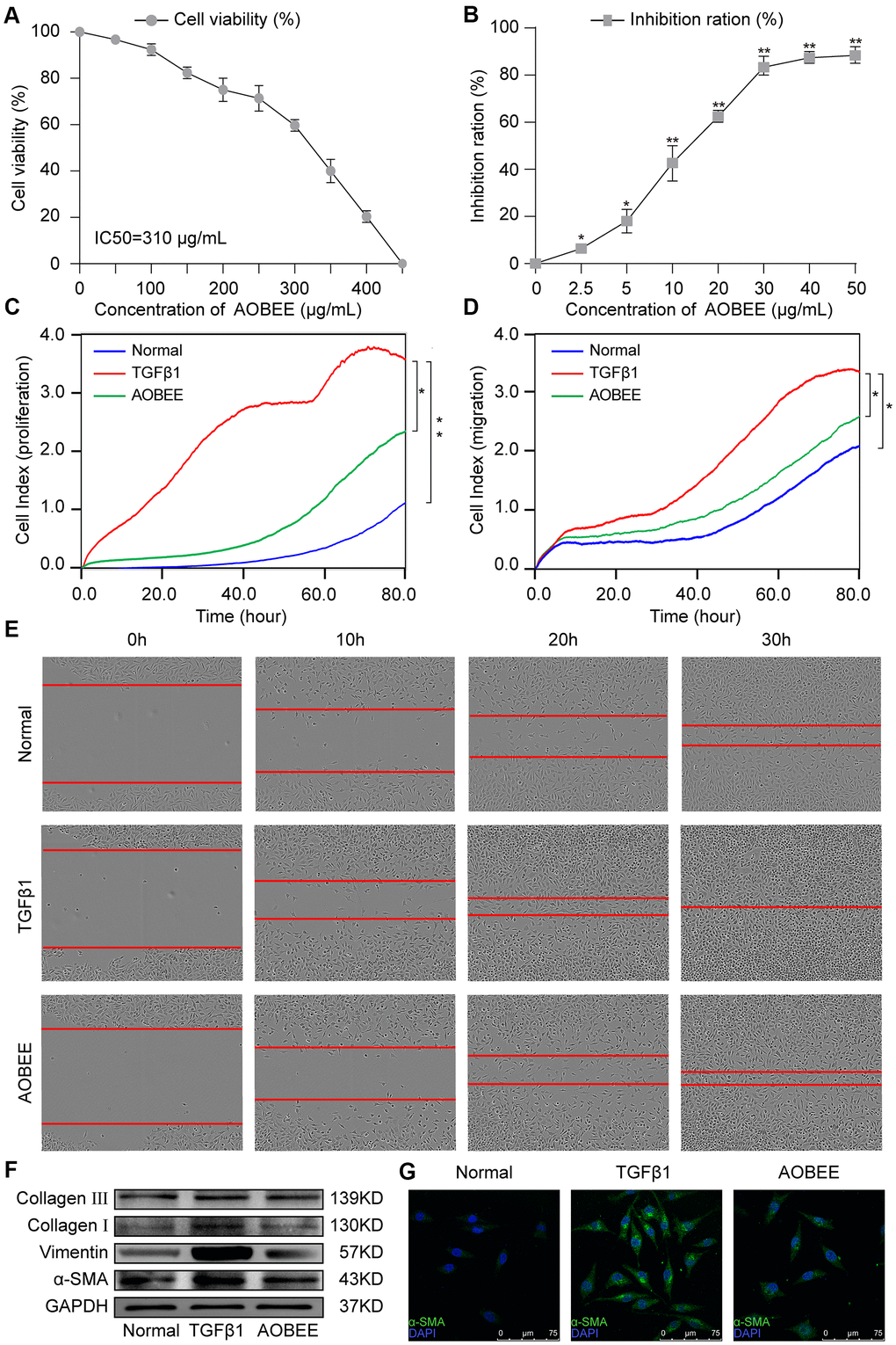 First, AOBEE toxicity was evaluated in vitro by using cell counting kit-8 assay (CCK-8). The mouse fibroblast L929 cells were incubated for 48 h under increasing concentrations of AOBEE. As compared with untreated cells, the half maximal inhibitory concentration (IC50) was 310 μg/mL (Figure 2A). To better understand the anti-fibrotic mechanism of AOBEE, 5 ng/mL of TGFβ1-activated mouse fibroblast L929 cells were selected to establish a pulmonary fibrosis cell model. Then, the inhibitory effects of AOBEE on L929 cells treated with TGFβ1 for 72 h were tested. AOBEE inhibited cell viability in a dose-dependent manner when the cells were exposed to graded doses (2.5–50 μg/mL) for 48 h. The most pronounced inhibition was at the beginning of 10 μg/mL (Figure 2B). After 30 μg/mL, the inhibition rate did not increase significantly. So 24 μg/mL concentration was used for further in vitro studies. Real-time cellular analysis (RTCA) experiments were performed to monitor the proliferation and migration of activated L929 cells. The curves demonstrated that AOBEE inhibited activated fibroblast proliferation and migration compared with TGFβ1 treatment alone (Figure 2C, 2D). The wound healing results confirmed that AOBEE repressed the migration of activated fibroblast (Figure 2E). The change of fibroblast shape and reduction of collagen deposition, α-SMA, and vimentin indicated that AOBEE had an obvious anti-pulmonary fibrosis effect by blocking the proliferation and migration of the activated fibroblasts (Figure 2F, 2G).