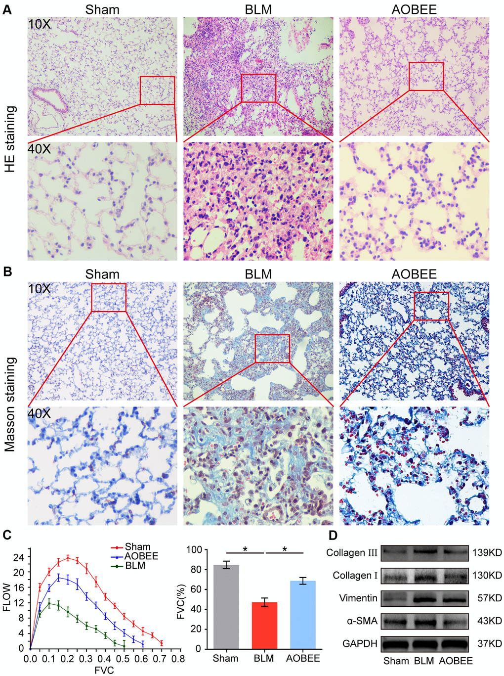 Then, the anti-pulmonary fibrosis effect of AOBEE was further explored in vivo by using Hematoxylin eosin (HE) and Masson staining, pulmonary function and fibrotic marker proteins in a bleomycin (BLM)-induced mouse model. The results of HE staining showed that the alveolar structure in the BLM group mice were damaged and accompanied by slight inflammatory cell infiltration. AOBEE treatment improved the symptoms and alveolar structure (Figure 3A). Masson staining demonstrated that AOBEE significantly reduced collagen fibers compared with those in the BLM-induced group (Figure 3B). Meanwhile, AOBEE treatment obviously promoted FVC and pulmonary compliance in mice (Figure 3C) and induced a considerable decrease in fibrotic marker proteins collagen I and III, vimentin, and α-SMA (Figure 3D). All the above findings indicated that AOBEE had an anti-pulmonary fibrosis effect in vivo.