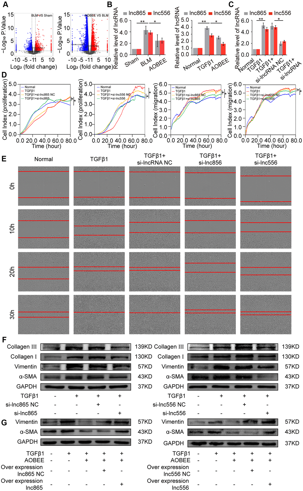 Next, small interfering RNAs of lnc865 and lnc556 (si-lnc865 and si-lnc556) were designed to investigate the function of lnc865 and lnc556 under AOBEE treatment. After transfection with si-lnc865 and si-lnc556, the expression level of lnc865 and lnc556 was significantly downregulated compared with the control group (Figure 4C), indicating that interference was effective. The real-time cell proliferation and migration curves showed that the knockdown of lnc865 and lnc556 inhibited the proliferation and migration of cells activated by TGFβ1 (Figure 4D). The wound healing assay confirmed these results (Figure 4E). Meanwhile, the expression levels of fibrotic marker proteins, such as collagen, vimentin, and α-SMA, were downregulated in the si-lnc865 and si-lnc556 groups (Figure 4F). The above findings suggested that lnc865 and lnc556 increased the development of pulmonary fibrosis, and AOBEE alleviated the pulmonary fibrosis process by inhibiting lnc865- and lnc556-mediated signal pathways. The rescue experiments were further designed to verify that the treatment of AOBEE depended on lnc865 and lnc556. The results showed that AOBEE reduced the expression of α-SMA, vimentin. Whereas, both lnc865 and lnc556 overexpression reversed AOBEE treatment effect (Figure 4G).