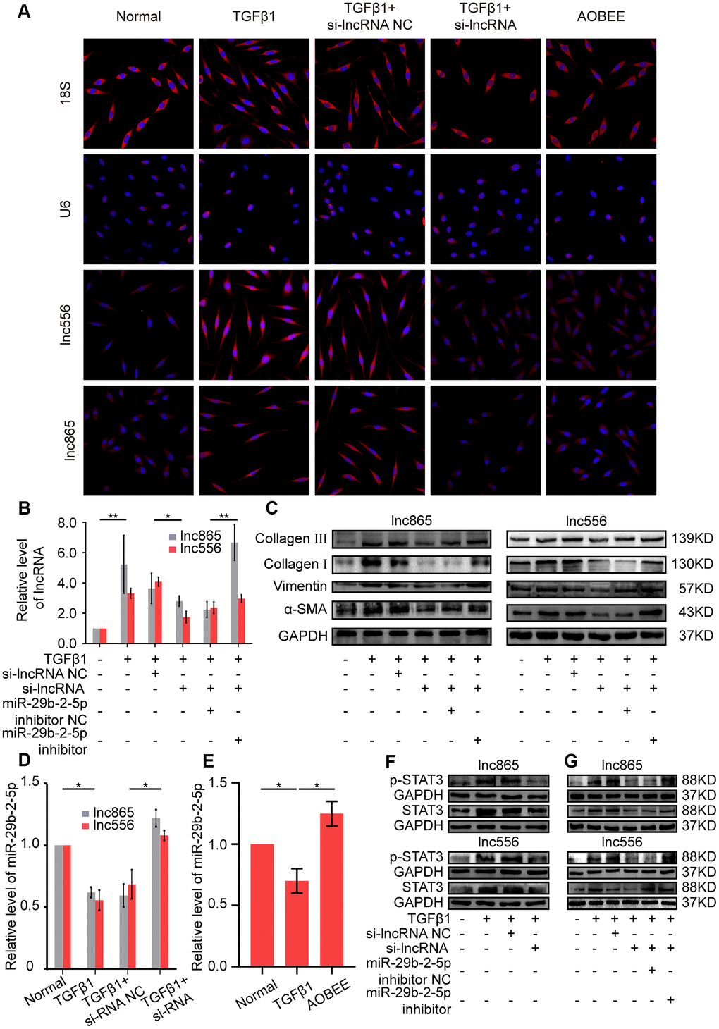 Gene location determines the regulatory pattern of genes, such as transcriptional regulation or post-transcriptional regulation. Single-molecule RNA fluorescence in situ hybridization (FISH) results exhibited that lnc865 and lnc556 were mainly enriched in the cytoplasm, indicating that they exercised post-transcriptional regulation on their target genes. Meanwhile, AOBEE treatment caused a considerable decrease in lnc865 and lnc556 expression but did not induce their translocation (Figure 5A). The common post-transcriptional pattern of lncRNA is competing endogenous RNA in the cytoplasm, in which lncRNA has the same miRNA response elements (MREs) like mRNA, and competes with mRNA to bind miRNA. Through this sponge function, lncRNA inhibits or activates the targeted mRNA [13]. Our previous study confirmed that miR-29b-2-5p is one of the target miRNAs for lnc865 and lnc556, and it also can be binded by signal transducer and activator of transcription 3 (STAT3) [12]. Thus, the regulatory role of miR-29b-2-5p was investigated under AOBEE action. The rescue experiments validated that RNA interference of lnc865 and lnc556 caused an obvious decrease of lnc865, lnc556, and fibrotic proteins including vimentin, α-SMA, and collagen I and III; however, the miR-29b-2-5p inhibitor reversed their downward trend, indicating that the pro-fibrotic function of lnc865 and lnc556 depended on miR-29b-2-5p (Figure 5B, 5C). After RNA interference on lnc865 and lnc556, miR-29b-2-5p increased (Figure 5D). Further qRT-PCR results demonstrated that AOBEE treatment enhanced miR-29b-2-5p expression (Figure 5E). RNA interference on lnc865 and lnc556 reduced STAT3 and p-STAT3 expression (Figure 5F). And the rescue experiments further elucidated that the miR-29b-2-5p inhibitor reversed the downward trend of STAT3 and p-STAT3 (Figure 5G), which indicated that the inhibition of si-lncRNA on STAT3 depended on miR-29b-2-5p. All the above findings revealed that AOBEE attenuated pulmonary fibrosis by inhibiting the lnc865/lnc556–miR-29b-2-5p–STAT3 axis.