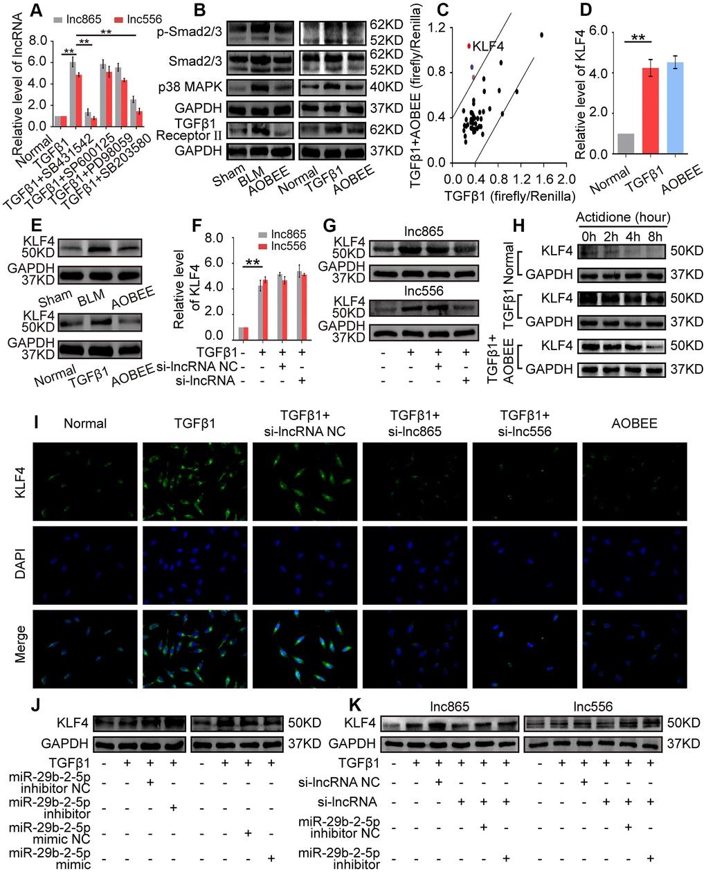 Then, the downstream pathway was detected by using the Cignal Finder 45-pathway reporter array. The results showed that AOBEE strongly repressed the luciferase activities of KLF4 reporter gene compared with those of other reporter genes (Figure 6C). qRT-PCR indicated that AOBEE had no effect on KLF4 at the mRNA level (Figure 6D), but Western blot results demonstrated that AOBEE inhibited KLF4 expression at the protein level in vivo and in vitro (Figure 6E). Si-lnc865 and si-lnc556 also had no effect on KLF4 at the mRNA level (Figure 6F), but the Western blot results demonstrated that si-lnc865 and si-lnc556 inhibited KLF4 expression at the protein level (Figure 6G). To clarify this finding, actidione, a protein synthesis inhibitor, was used to detect the degradation of KLF4 under AOBEE treatment. The degradation rate was the fastest in the normal group and the slowest in the TGFβ1 group. The results showed that TGFβ1 inhibited KLF4 degradation. Whereas, AOBEE promoted KLF4 degradation compared with TGFβ1 (Figure 6H). Immunofluorescence experiments further confirmed that AOBEE, si-lnc865, and si-lnc556 reduced KLF4 expression at the protein level (Figure 6I). To infer, AOBEE may decrease the translation of KLF4, not its transcription, as well as lnc865 and lnc556. The miR-29b-2-5p inhibitor increased KLF4 expression, but the miR-29b-2-5p mimic decreased KLF4 expression (Figure 6J). The rescue experiments identified that si-lnc865 and si-lnc556 prevented KLF4 expression at the protein level, and the miR-29b-2-5p inhibitor reversed KLF4 expression (Figure 6K). All the above findings indicated that AOBEE prevented pulmonary fibrosis through the lnc865/lnc556 mediated downstream pathway of KLF4.